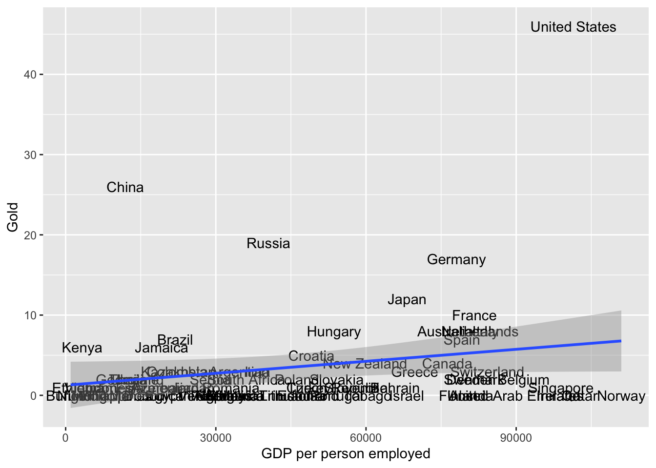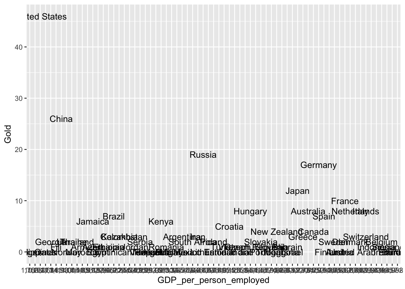 gdp_info <- gdp_info[[1]]There isn’t much we can do with a single column of data like this. So what if we scraped data about countries from another Wikipedia page and merged it to this one? For example, we could evaluate if GDP per hour worked (which implicitly adjusts for country size and captures hourly returns to labor) is correlated with how a country performed at the 2016 Olympic games.