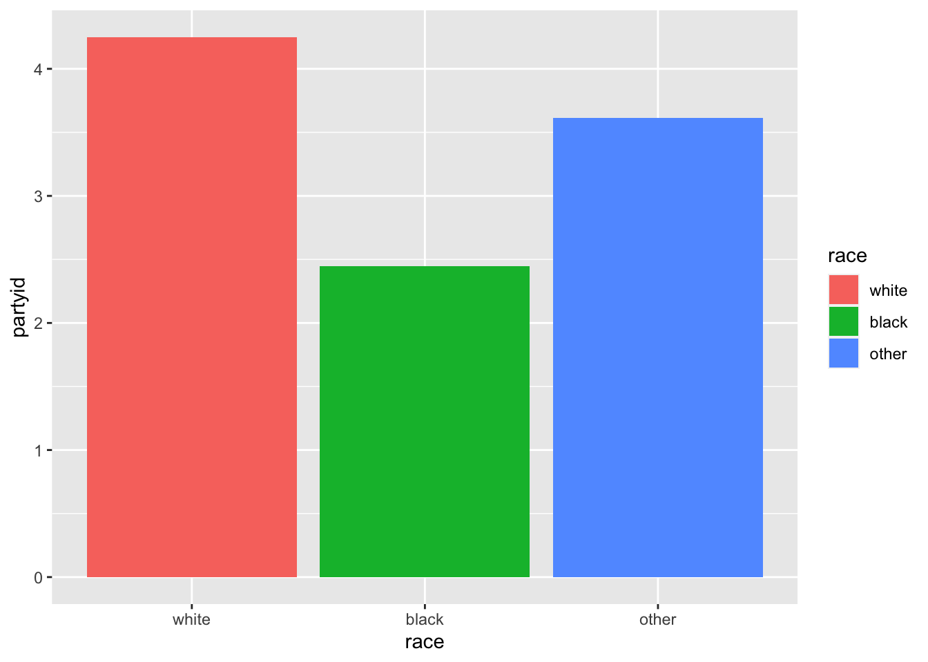 ggplot(vars_by_race, aes(x=race, y=partyid, fill=race)) +
