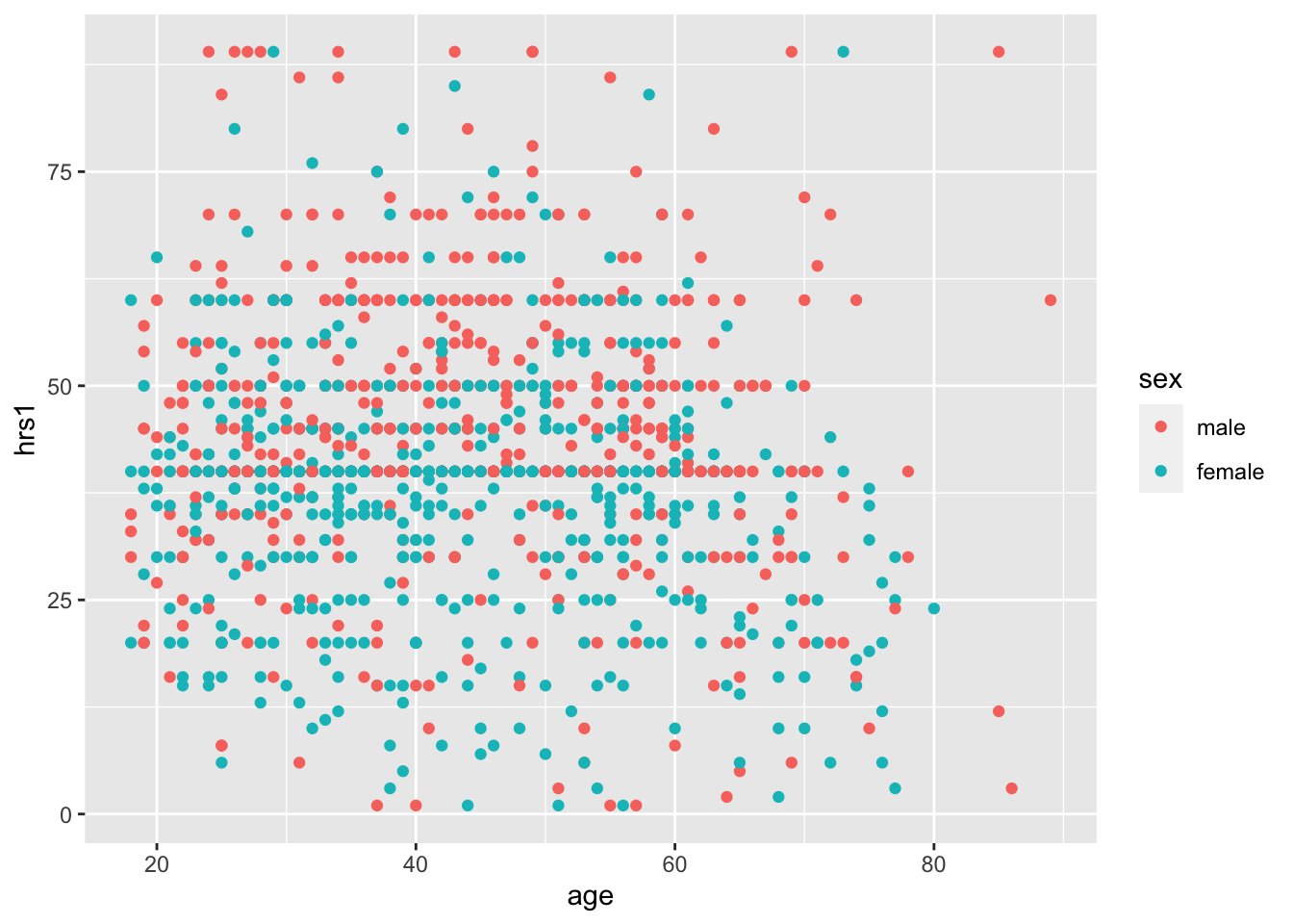 ggplot(data = gss, aes(x = age, y = hrs1, color = sex)) +