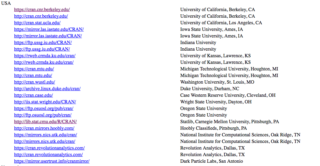 Choose a mirror (in other words, a website hosting current and past R distributions) located somewhere near to you. I am based in New York so I chose one based out of Carnegie Mellon in Pennsylvania.