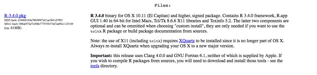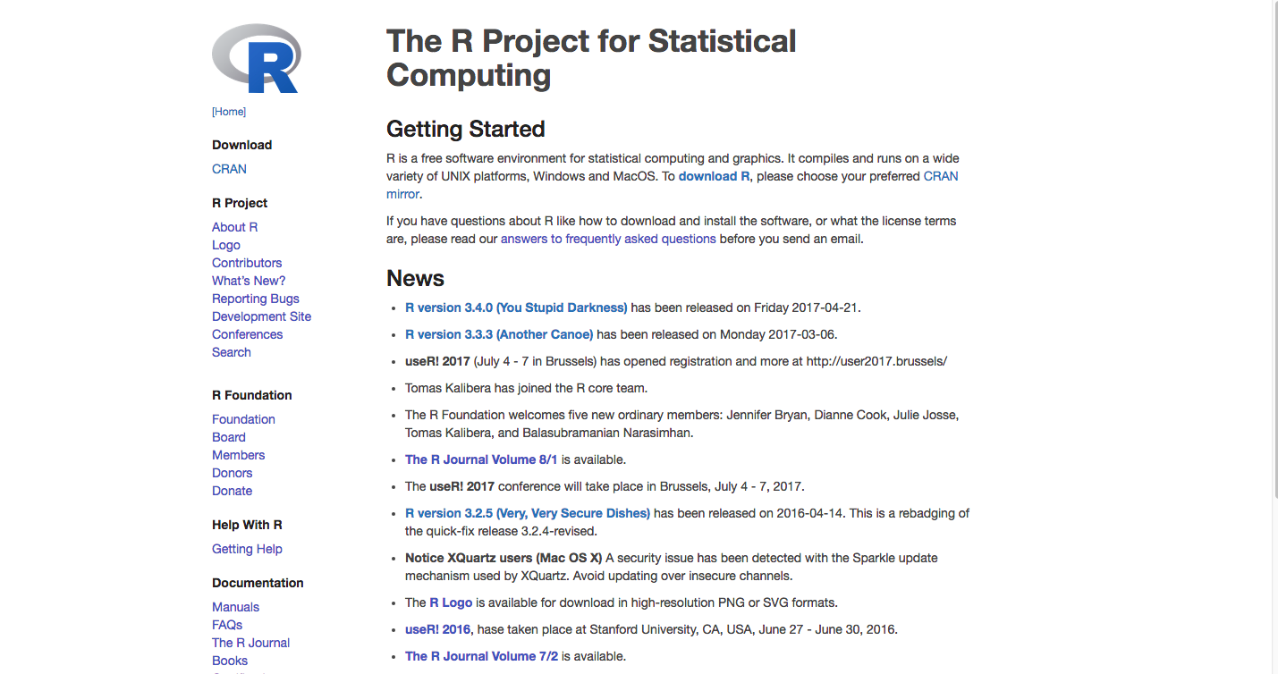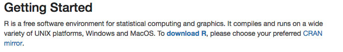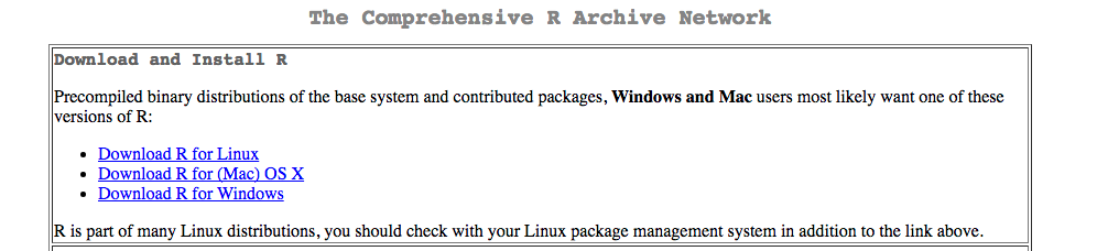 Download R by clicking on one of the “Download R for” links. Choose the link that accords with your operating system. I am using Mac, so I clicked: “Download R for (Mac) OS X”