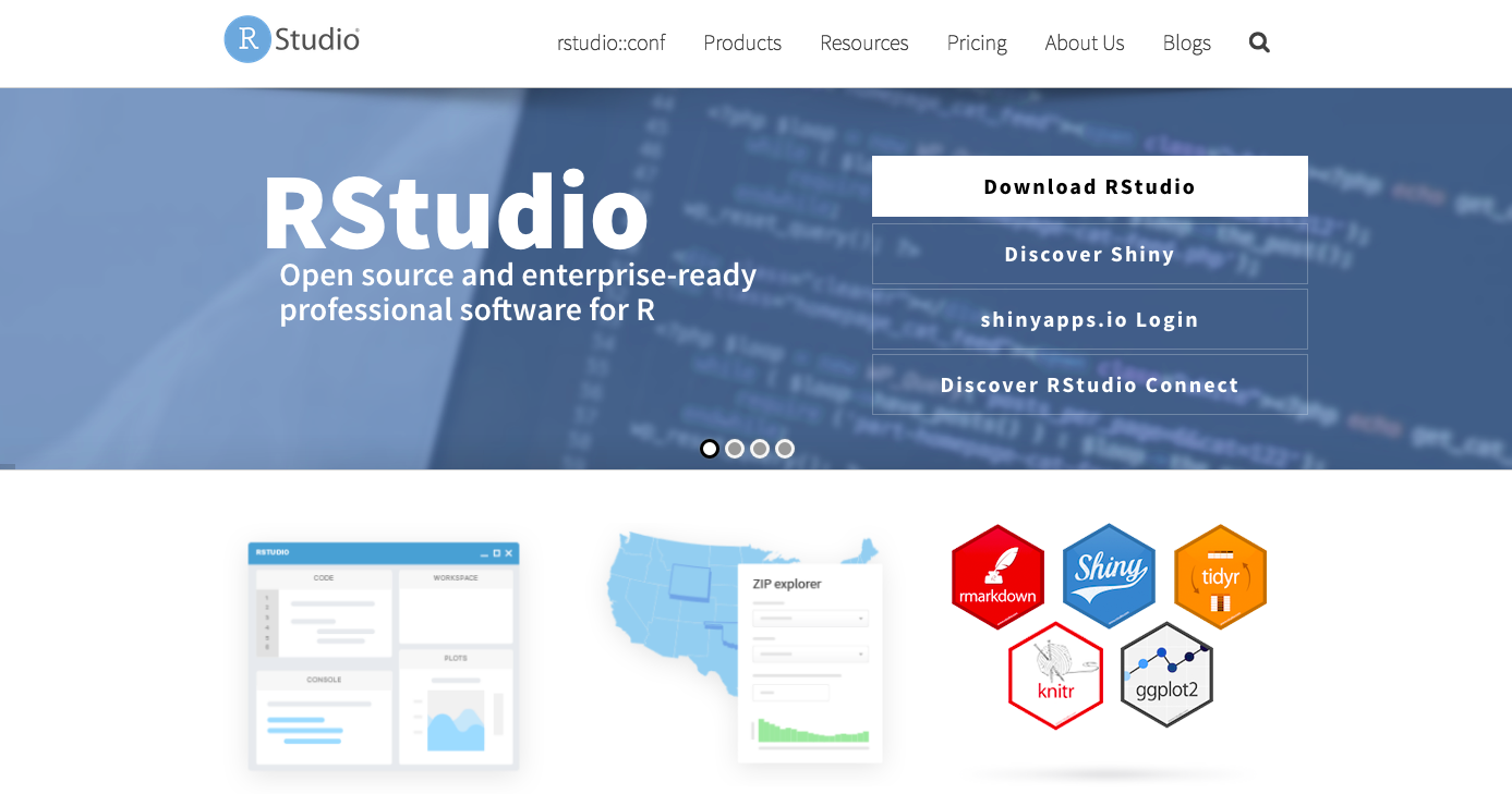To download RStudio, navigate to https://www.rstudio.com/ and click the download RStudio button: