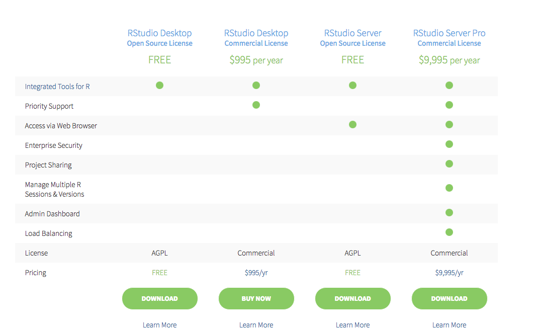 Scroll down and click on the green “Download” button in the RStudio Desktop column. RStudio is free!
