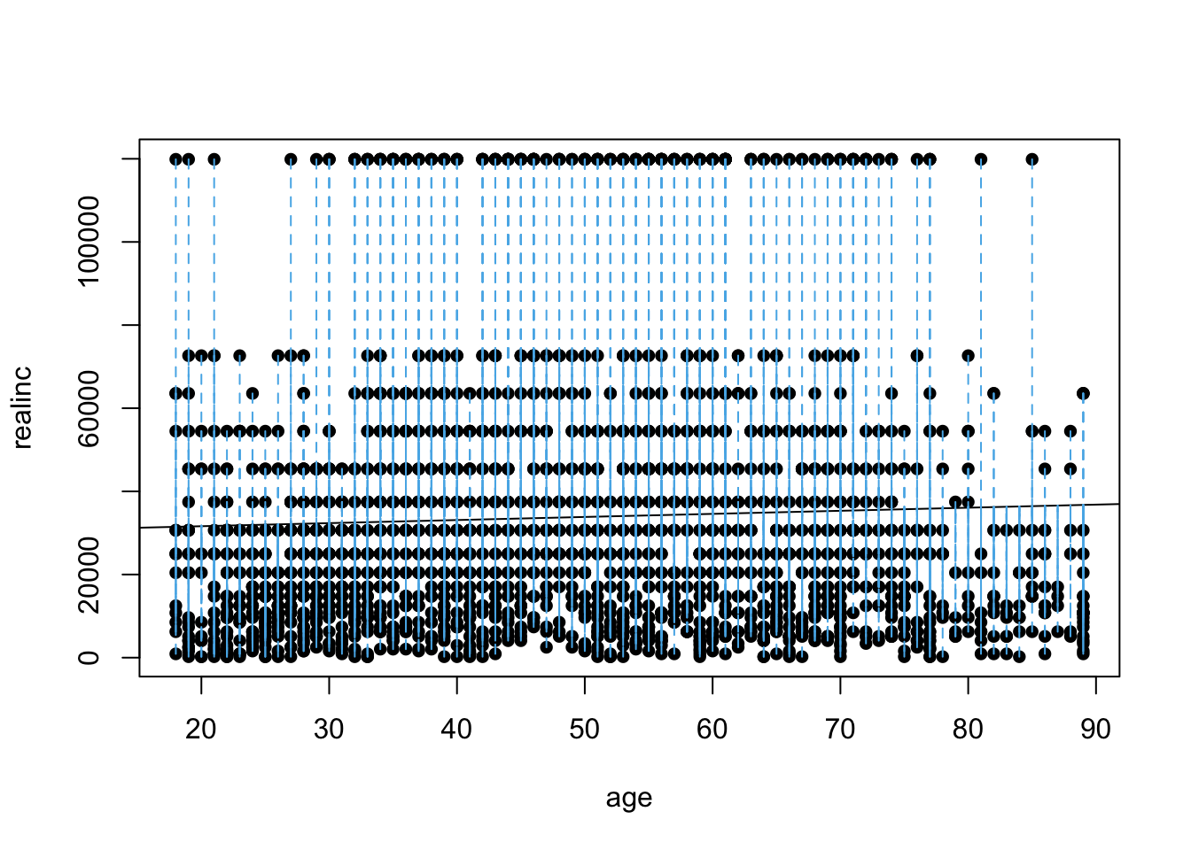 How do we fit a line to x and y? The short of it is that we will start with line (say, a horizontal one) and keep adjusting the slope and intercept of that line to minimize the average distance between the data points and the line itself. To see how this works, we can use the plot_ss function, taken from the statsr package. We will explore the relationship between age and income. Make sure you have the GSS data in your R environment.