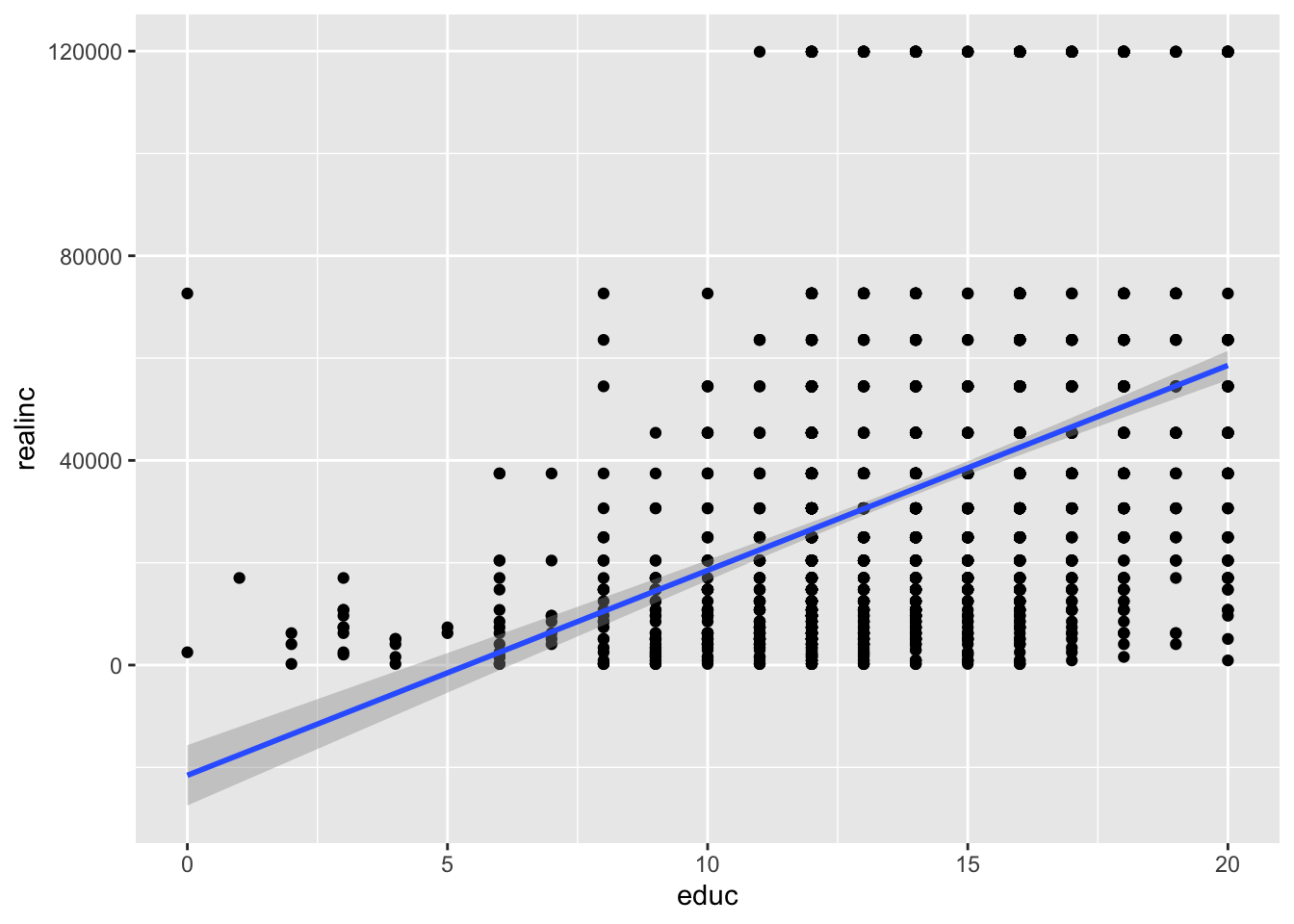 ggplot(gss, aes(x = educ, y = realinc)) +