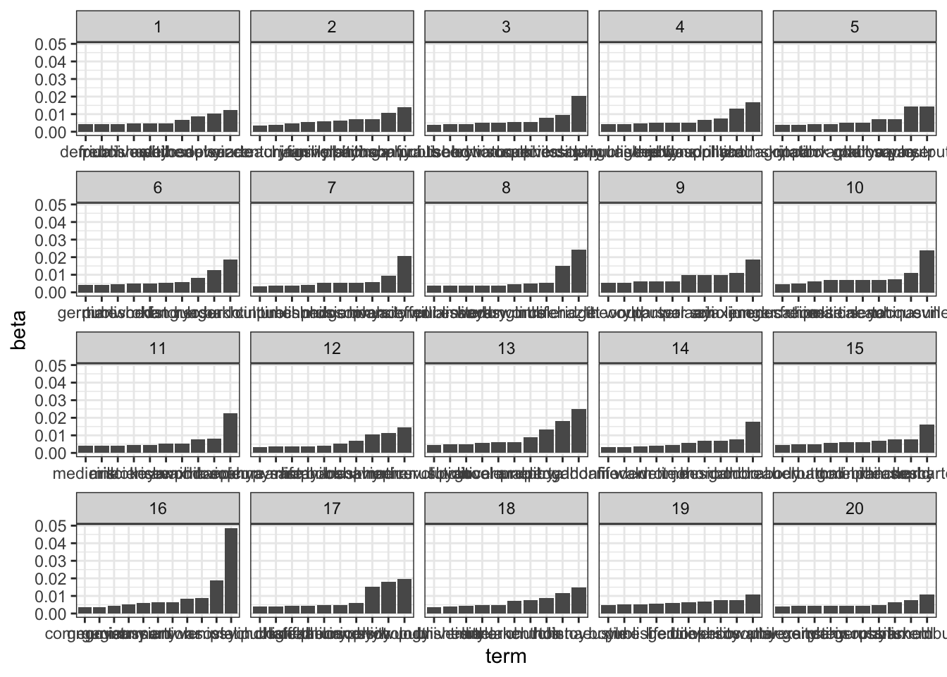 arrange(topic, -beta)We can plot the results using ggplot as a series of bar plots