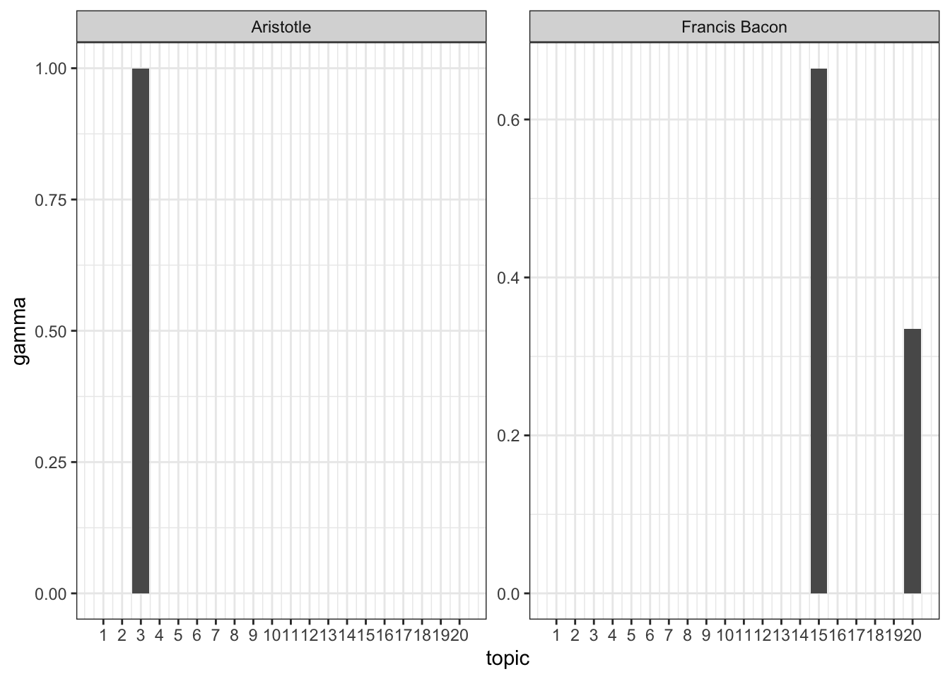 What if want to look at the extent to which each document or philosopher is composed of each topic? We can instead set matrix = “gamma” to get the gamma values, which tell you exactly that.