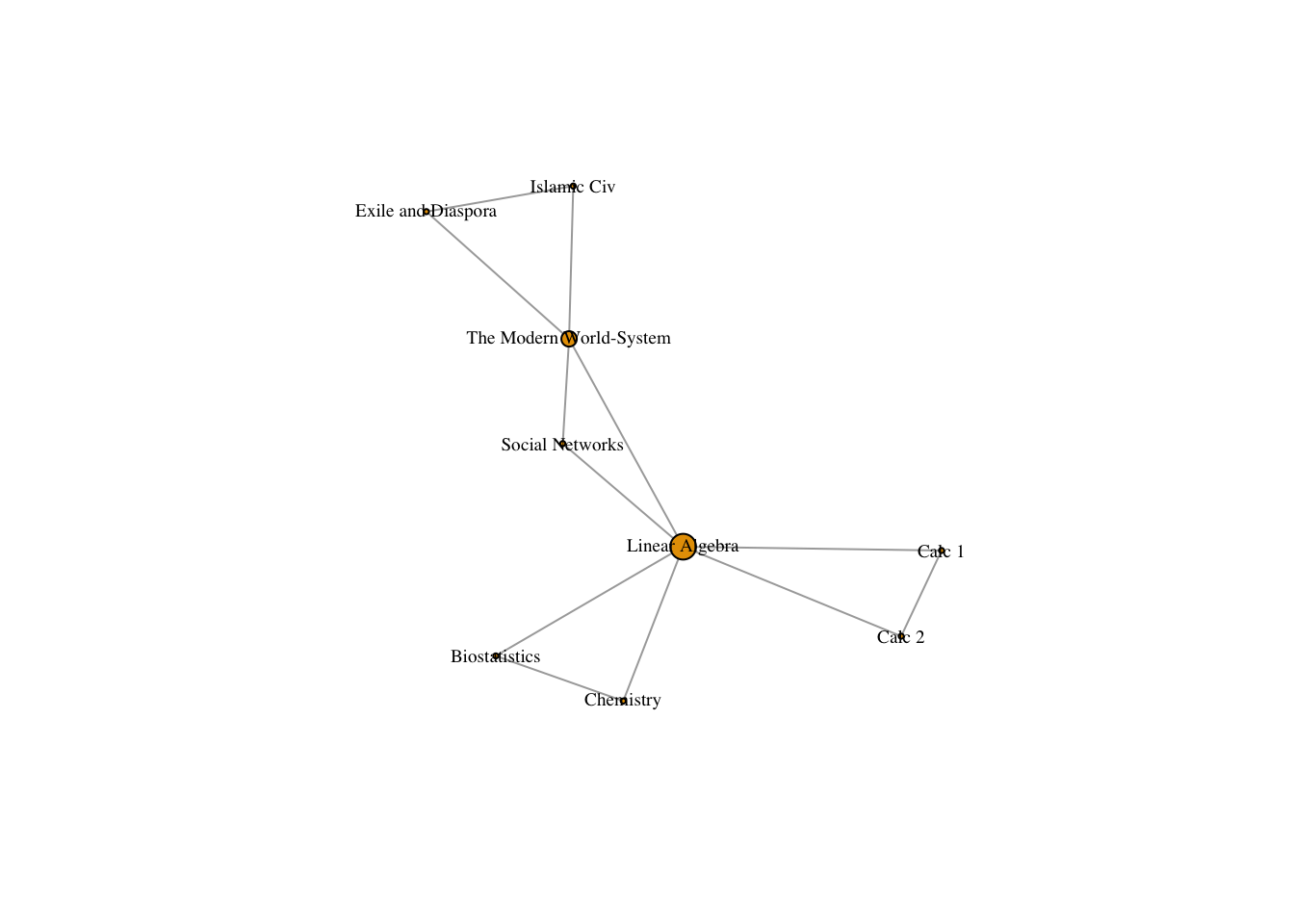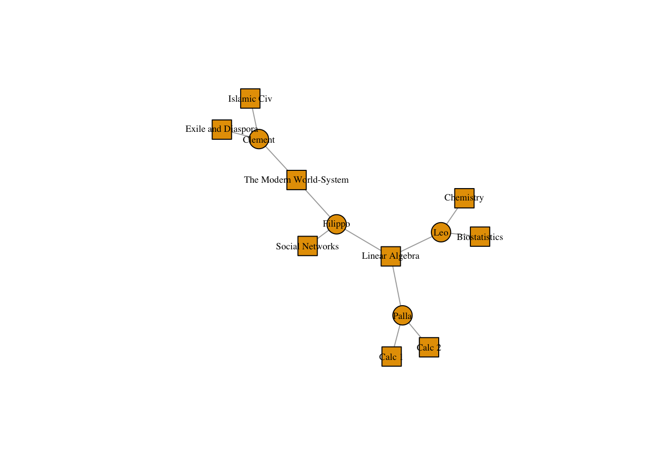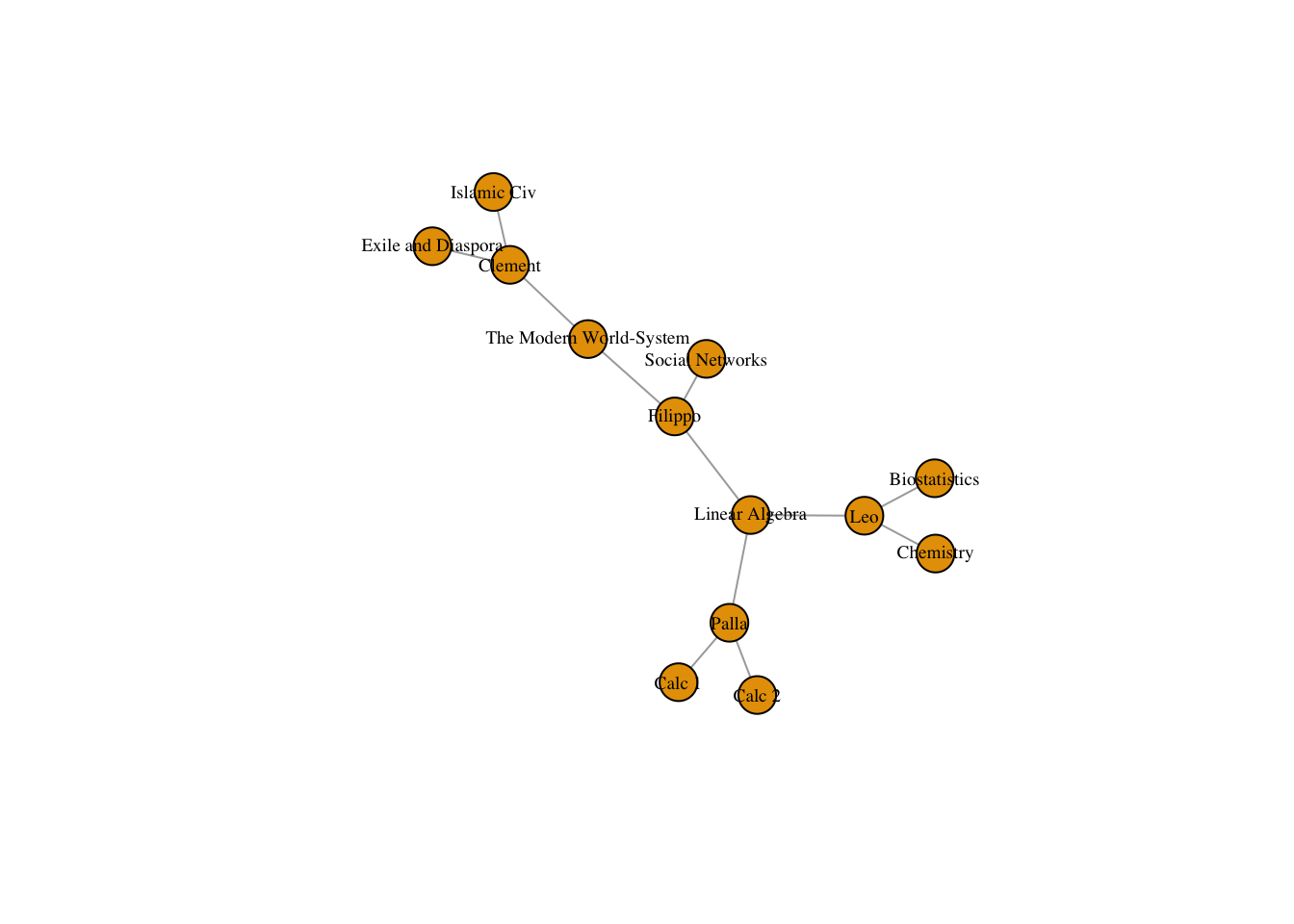 Person, Classes Leo, Biostatistics, Chemistry, Linear Algebra Clement, Islamic Civilization, The Modern World-System, Exile and Diaspora Paula, Calc 1, Calc 2, Linear Algebra, Filippo, Linear Algebra, Social Networks, The Modern World-System
