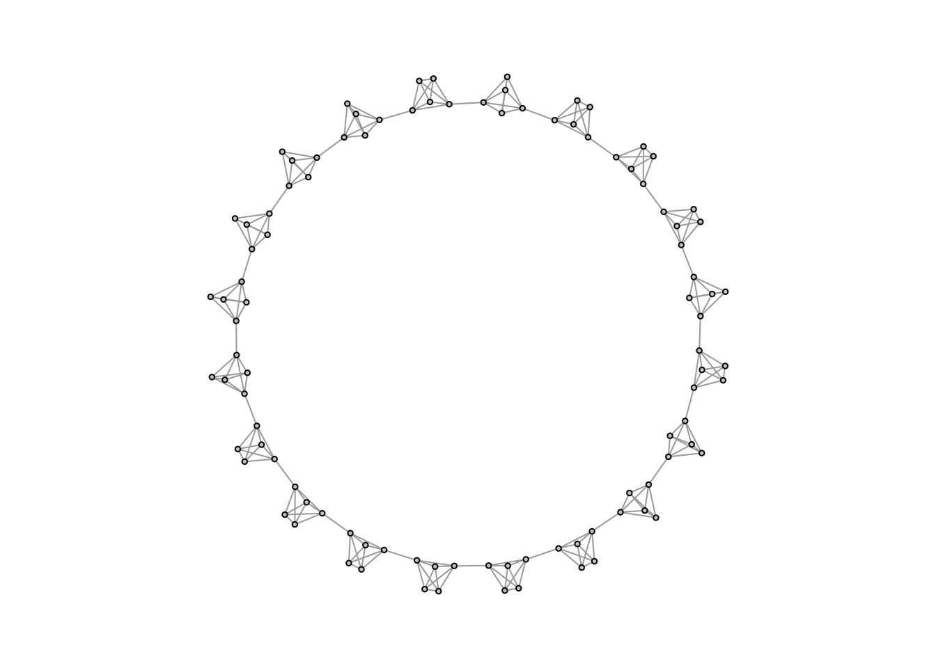 Path length is also high - basically it takes 10 steps, on average, to reach one node from a random other node. In the real world, there are way more than 100 people and more than 20 groups, so it should be even more surprising that the average degree of separation is roughly six or seven steps. It follows that the “caveman structure” is not a small-world.