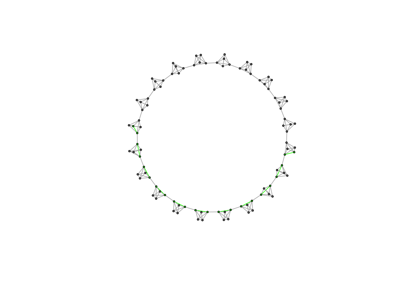 E(caveman_net)[edges_incident]$color<-"green" # Set the edges on the diameter to be green