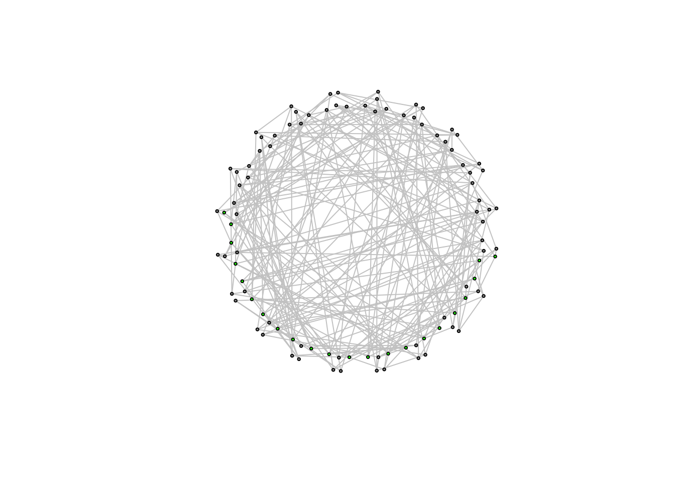 V(caveman_net)[nodes_diameter]$color<-"green" # Set the nodes on the diameter to be green