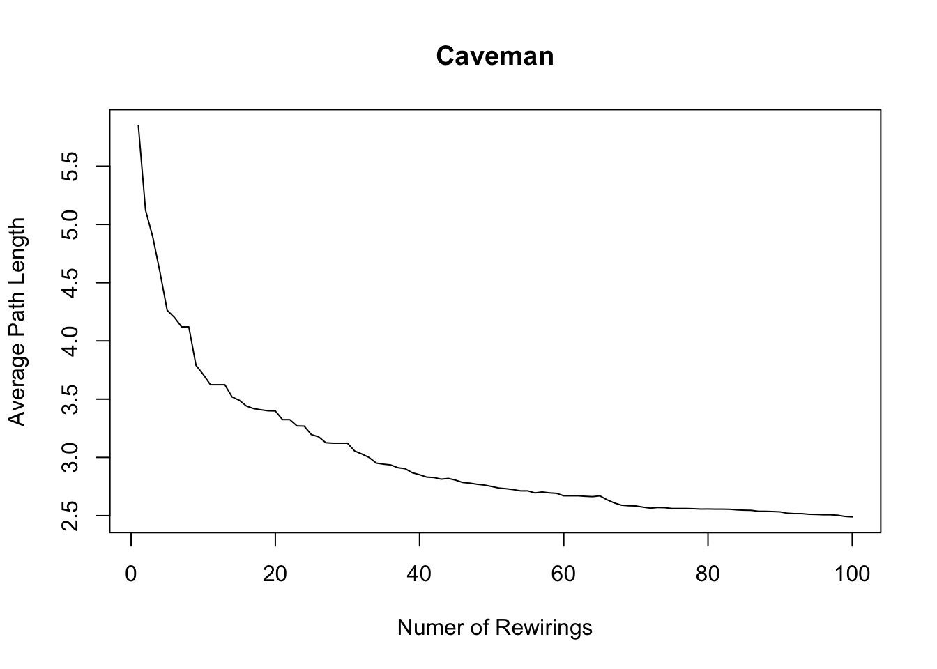 plot(1:100, avgpathlength, xlab = "Numer of Rewirings", ylab = "Average Path Length", main = "Caveman", type = "l")