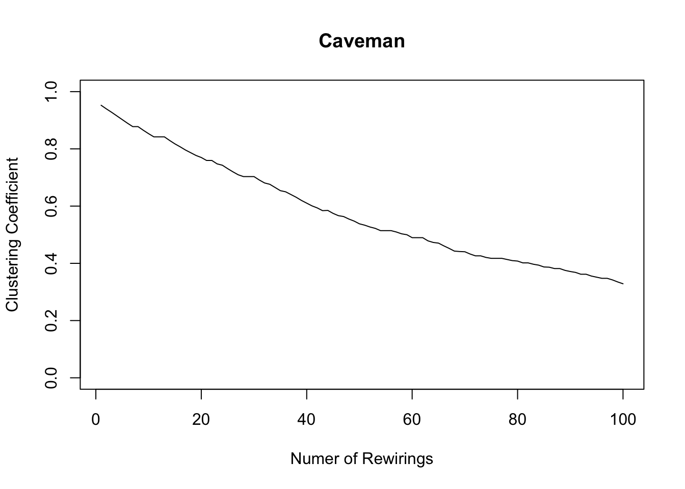 plot(1:100, clusteringcoefficient, xlab = "Numer of Rewirings", ylab = "Clustering Coefficient", main = "Caveman", type = "l", ylim = c(0,1))