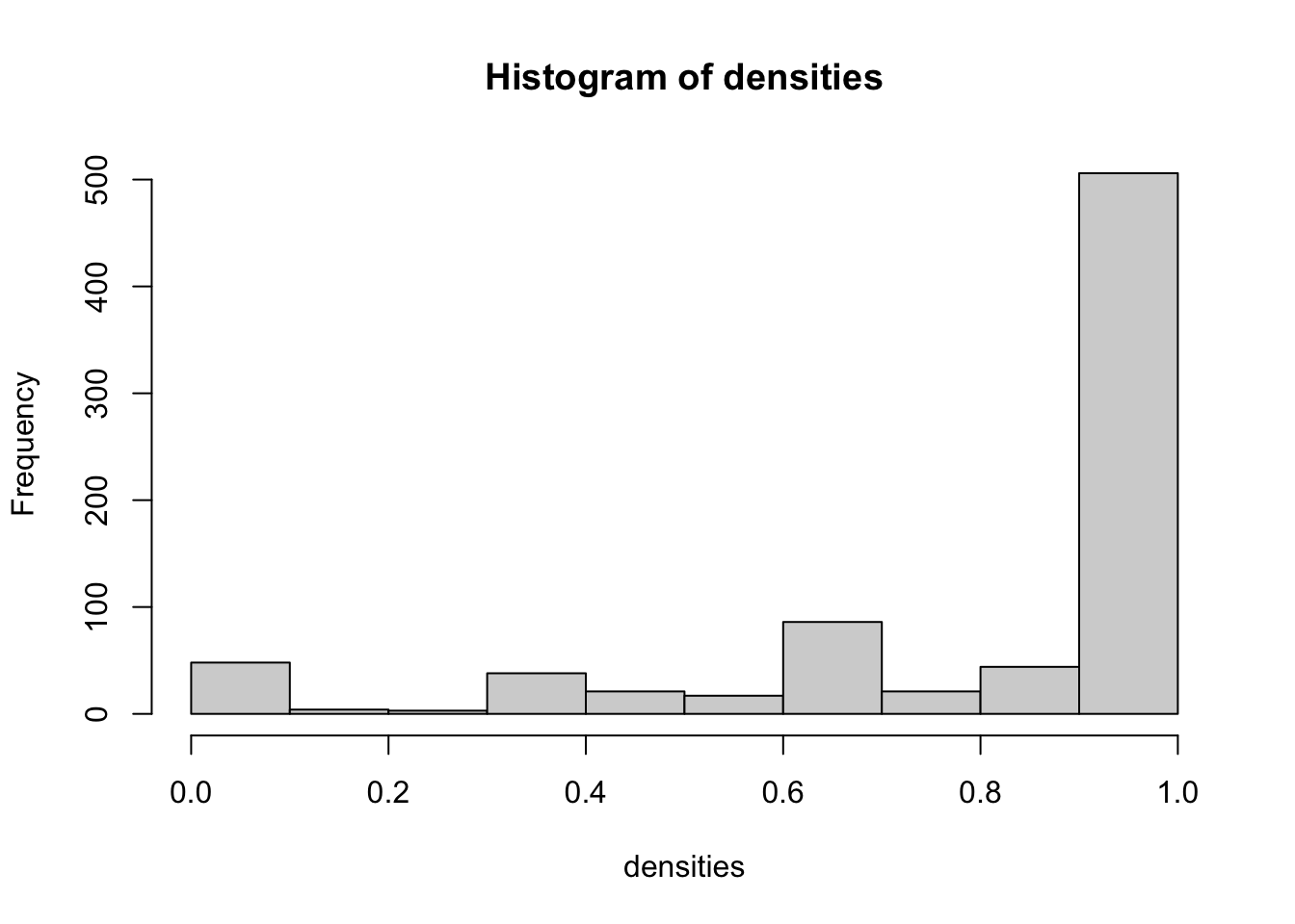 densities <- unlist(densities)To end the tutorial, let’s plot the distribution of density across the different ego networks.