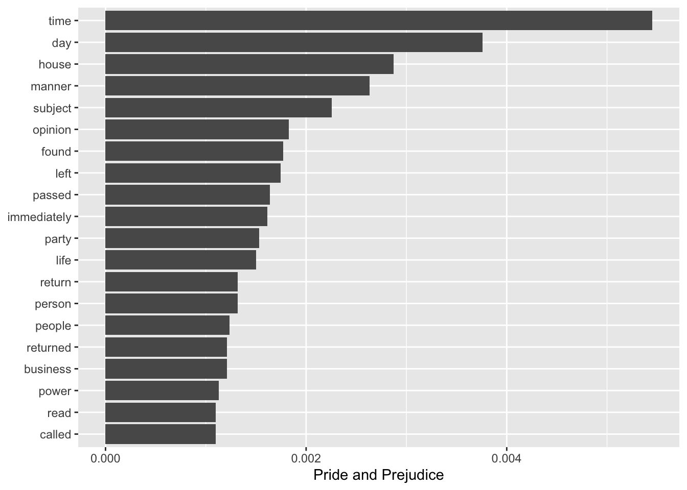 familiar_texts <- gutenberg_download(c(5, 1342), meta_fields = "title", mirror = "http://gutenberg.readingroo.ms/")One strategy for comparing texts is to compare the counts of the words used in them. The first step for counting words is tokenizing the texts - which means breaking sentences and paragraphs down into their respective words. We will then count how frequently each word occurs.
