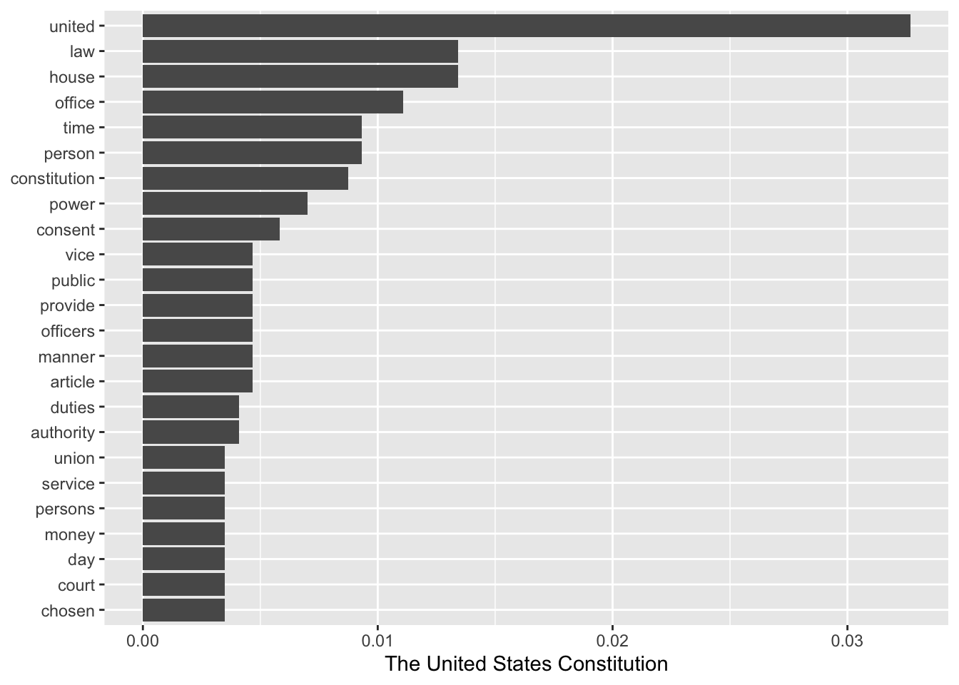 library(tidyverse)Let’s analyze two texts we are actually familiar with - how about the Constitution and Pride and Prejudice? I located their id in the metadata, 5 and 1342 respectively.