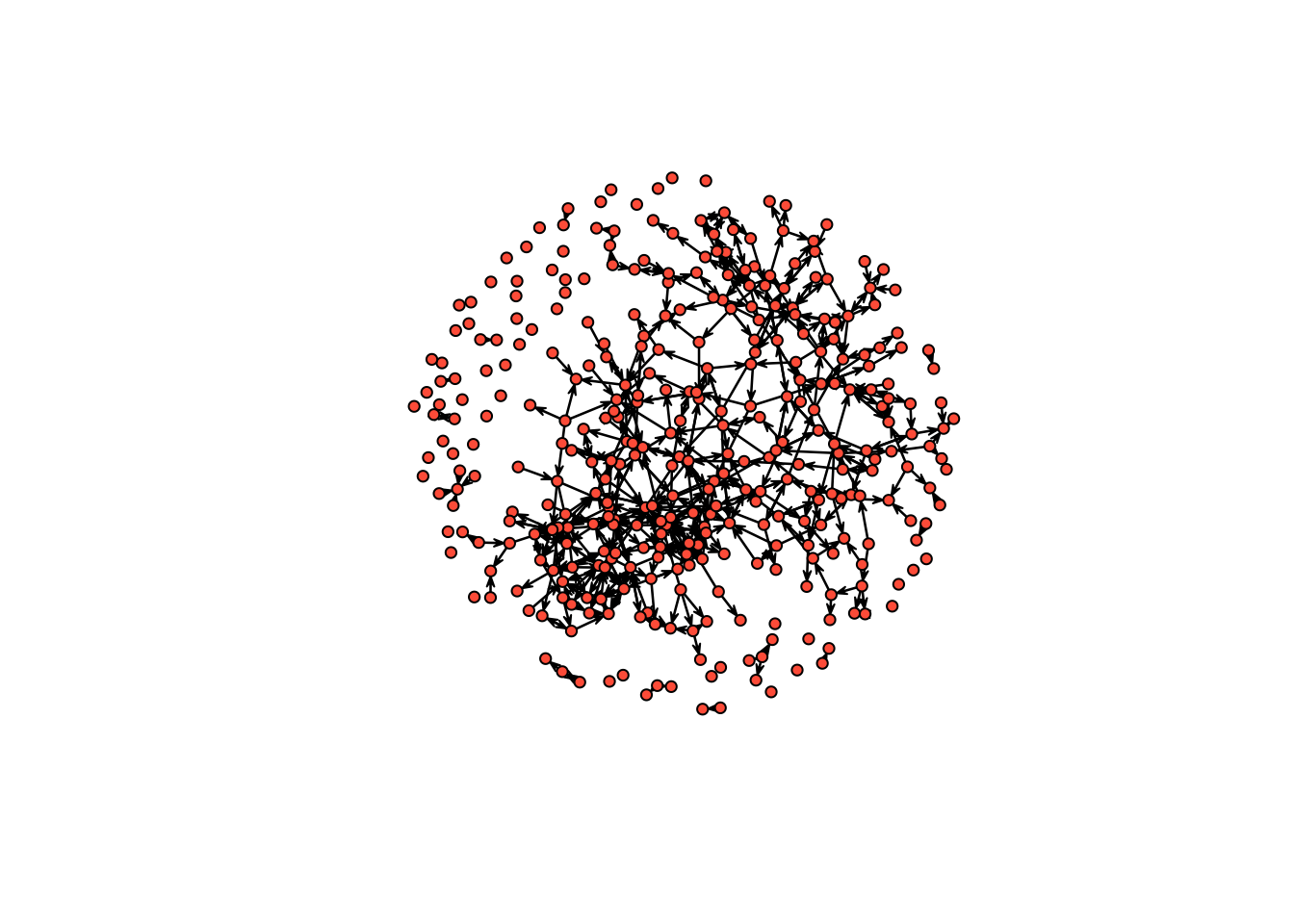 install.packages("intergraph")library(intergraph)Now that we have intergraph installed and in our R environment, we can use the asNetwork function to convert it to a statnet object. I will also subset the data here, because ERGMs take forever to run and the network is somewhat large (~1000 nodes).