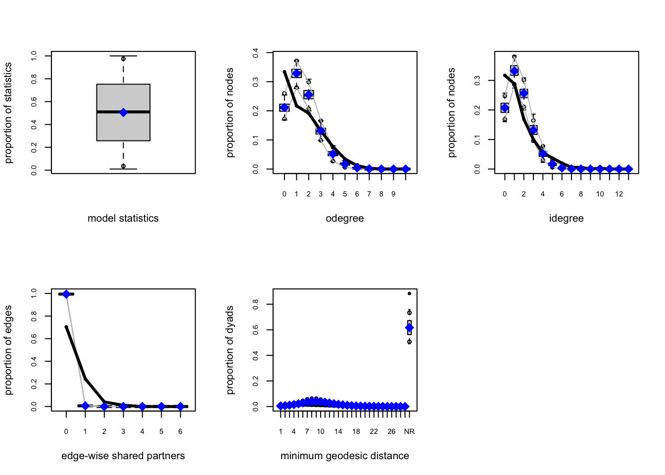 Another way to evaluate our model is to use the built-in goodness of fit measures. Essentially, we will evaluate whether our network has similar structural features as the simulated graphs. ergm has a built-in function - gof() - which calculates the statistics for us. We just have to tell it how many simulations we want to use in the comparison set - the larger the number, the more accurate representation of the model.