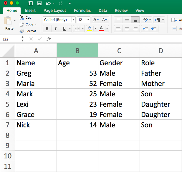 Let’s return to Excel and build an attribute dataset for our network. This kind of dataset is much more traditional: each row is a person (otherwise known as an observation) and each column accords with some attribute you measured for that person. Here is a picture of an example attribute dataset I made for my family’s money provision network.