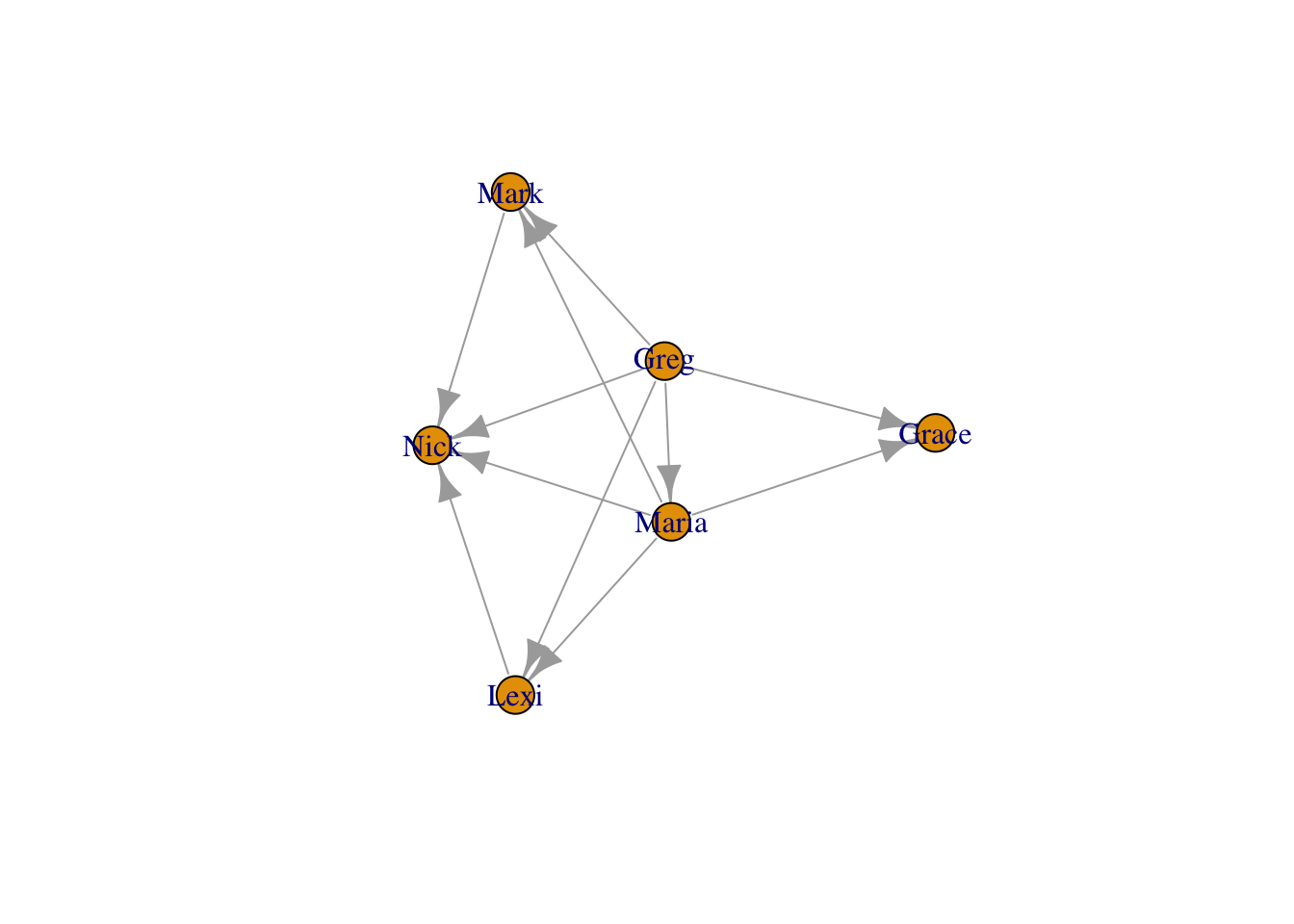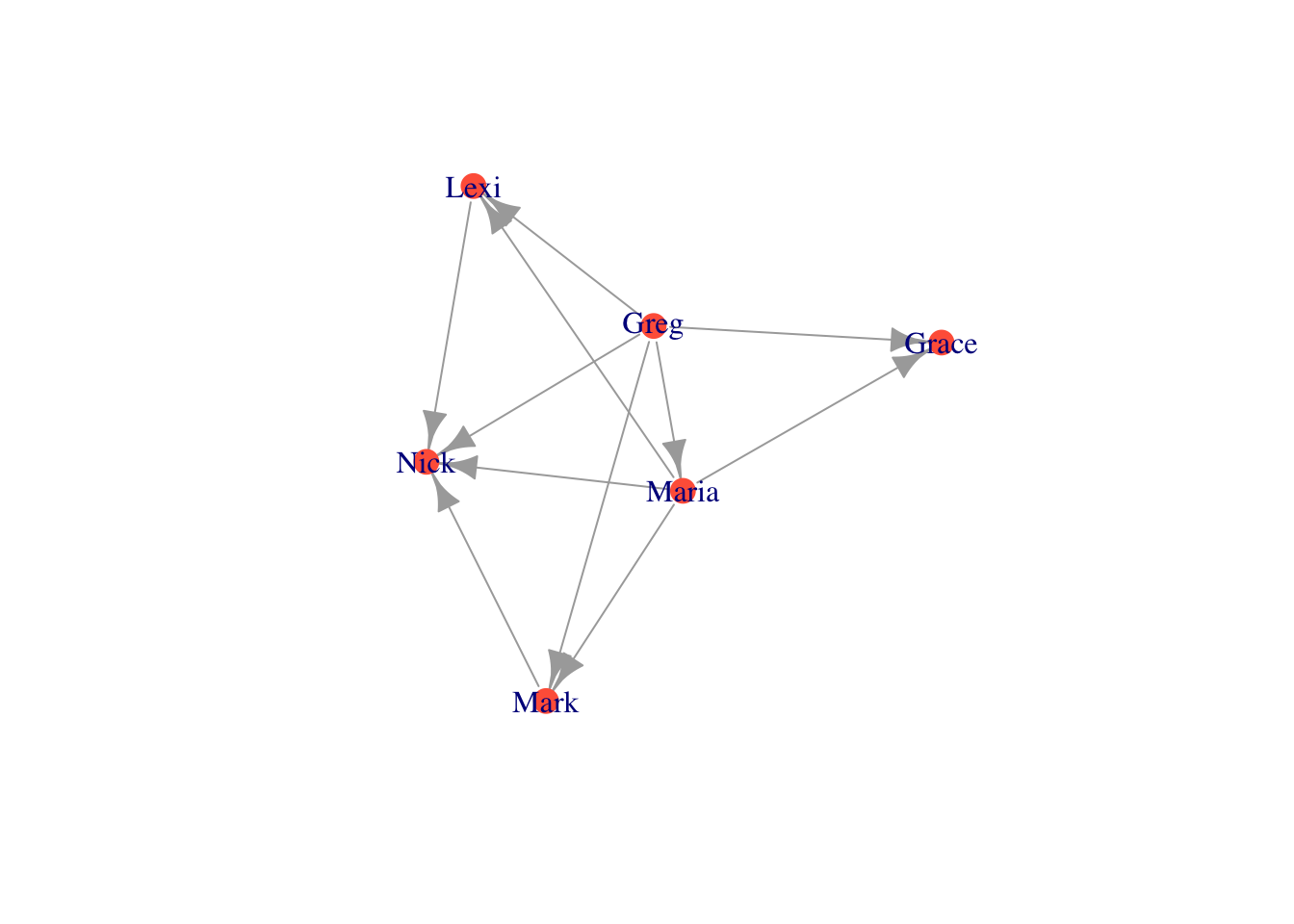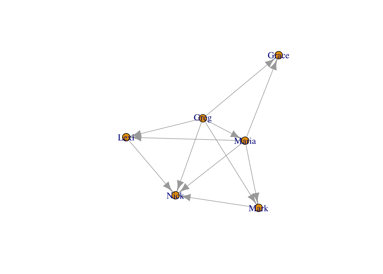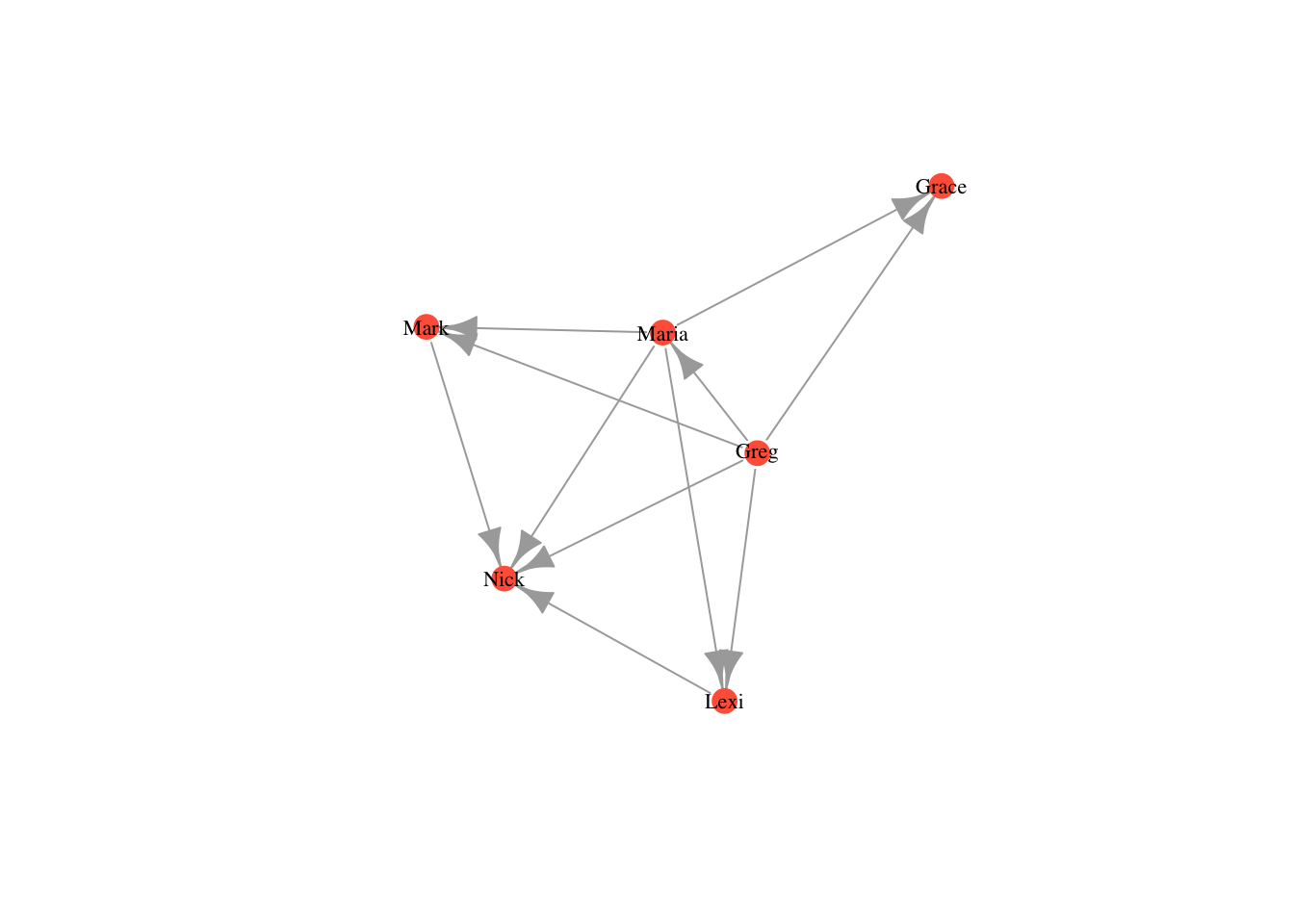## [1] Greg ->Maria Greg ->Mark Greg ->Lexi Greg ->Grace Greg ->Nick