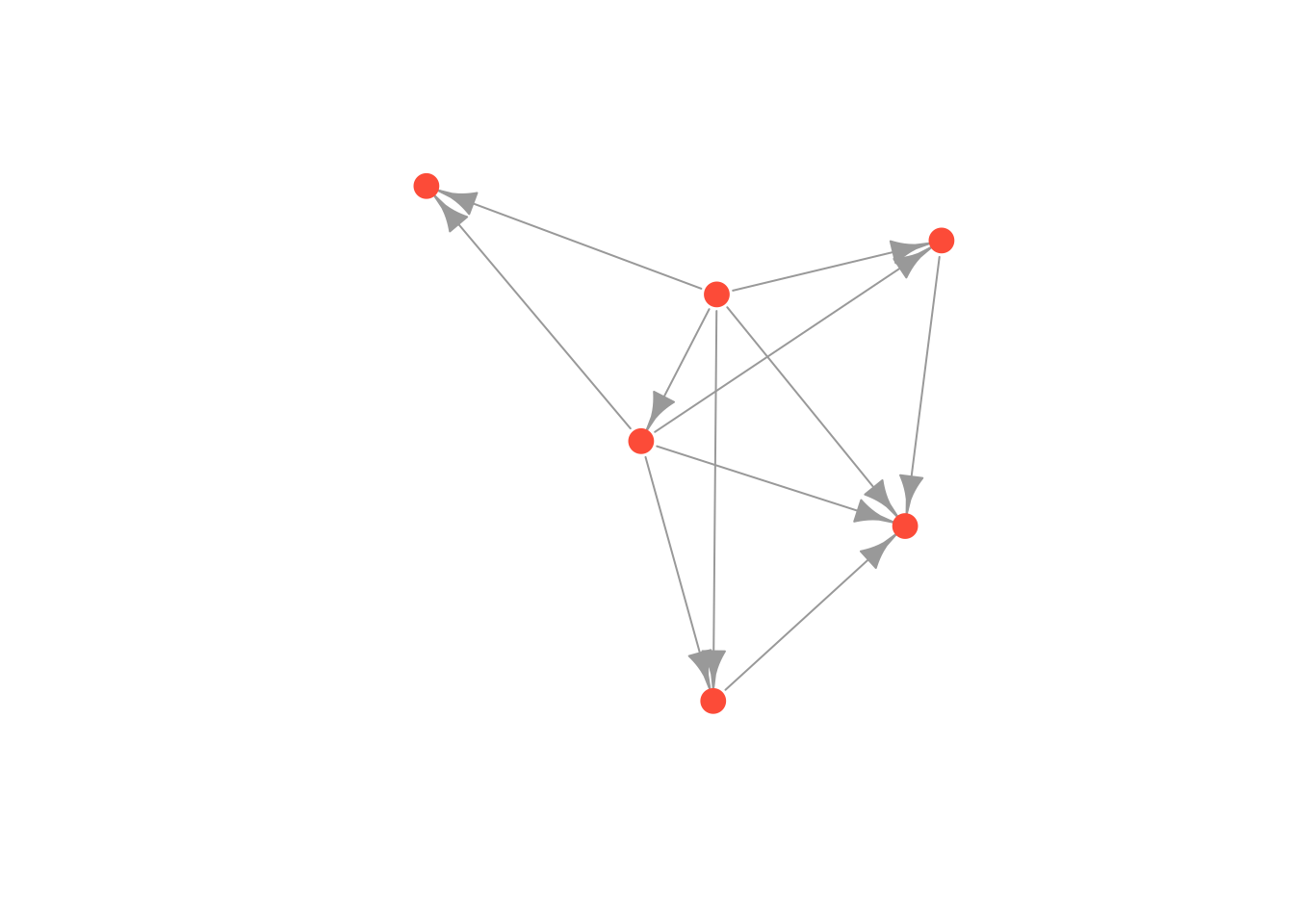 plot(moneyNetwork, vertex.size = 10, vertex.color = "tomato", vertex.frame.color = NA, vertex.label = NA)