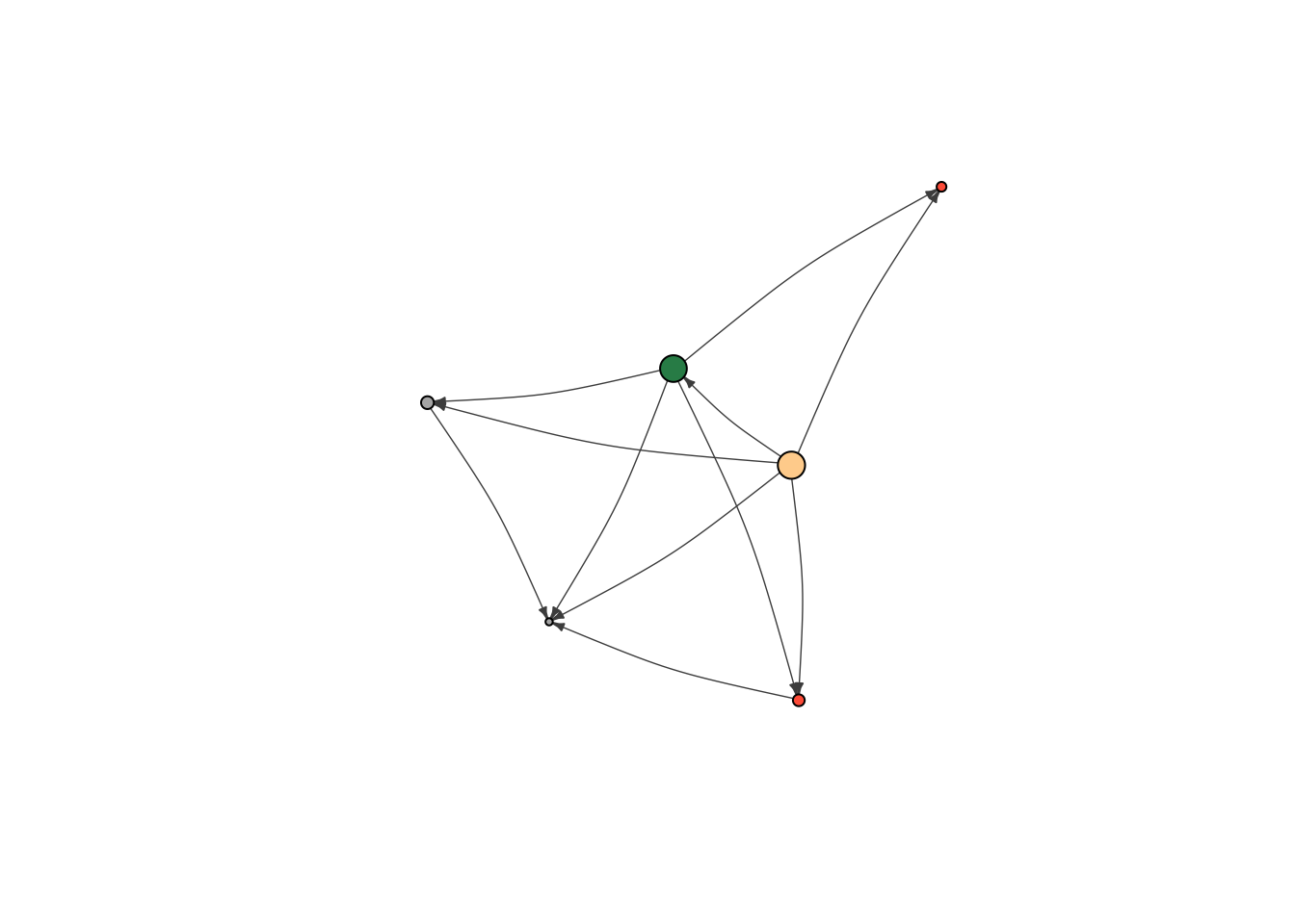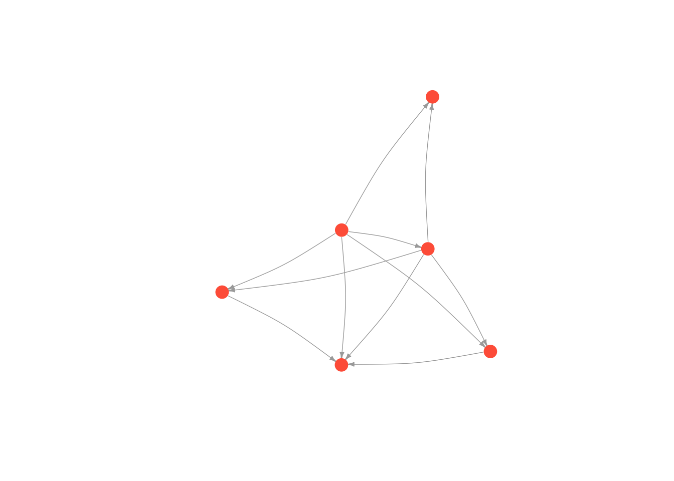 plot(moneyNetwork, layout = kamadaLayout, vertex.size = 10, vertex.color = "tomato", vertex.frame.color = NA, vertex.label.cex = .7, vertex.label = NA, edge.curved = .1, edge.arrow.size = .3, edge.width = .7)