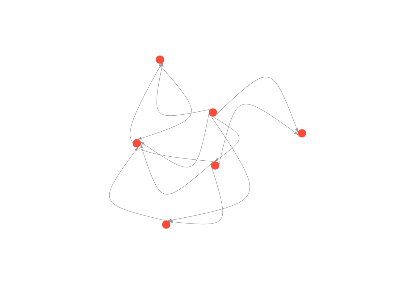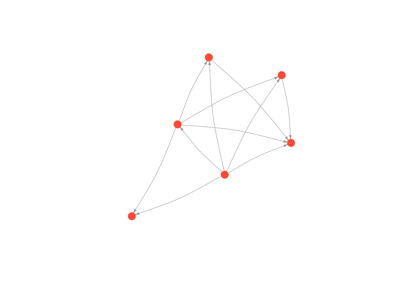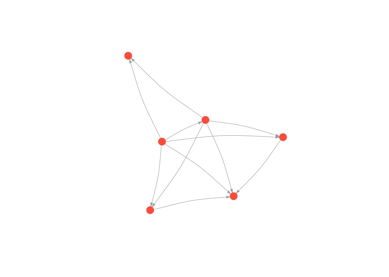 plot(moneyNetwork, vertex.size = 10, vertex.color = "tomato", vertex.frame.color = NA, vertex.label.cex = .7, vertex.label = NA, edge.curved = 1.7, edge.arrow.size = .3, edge.width = .7)