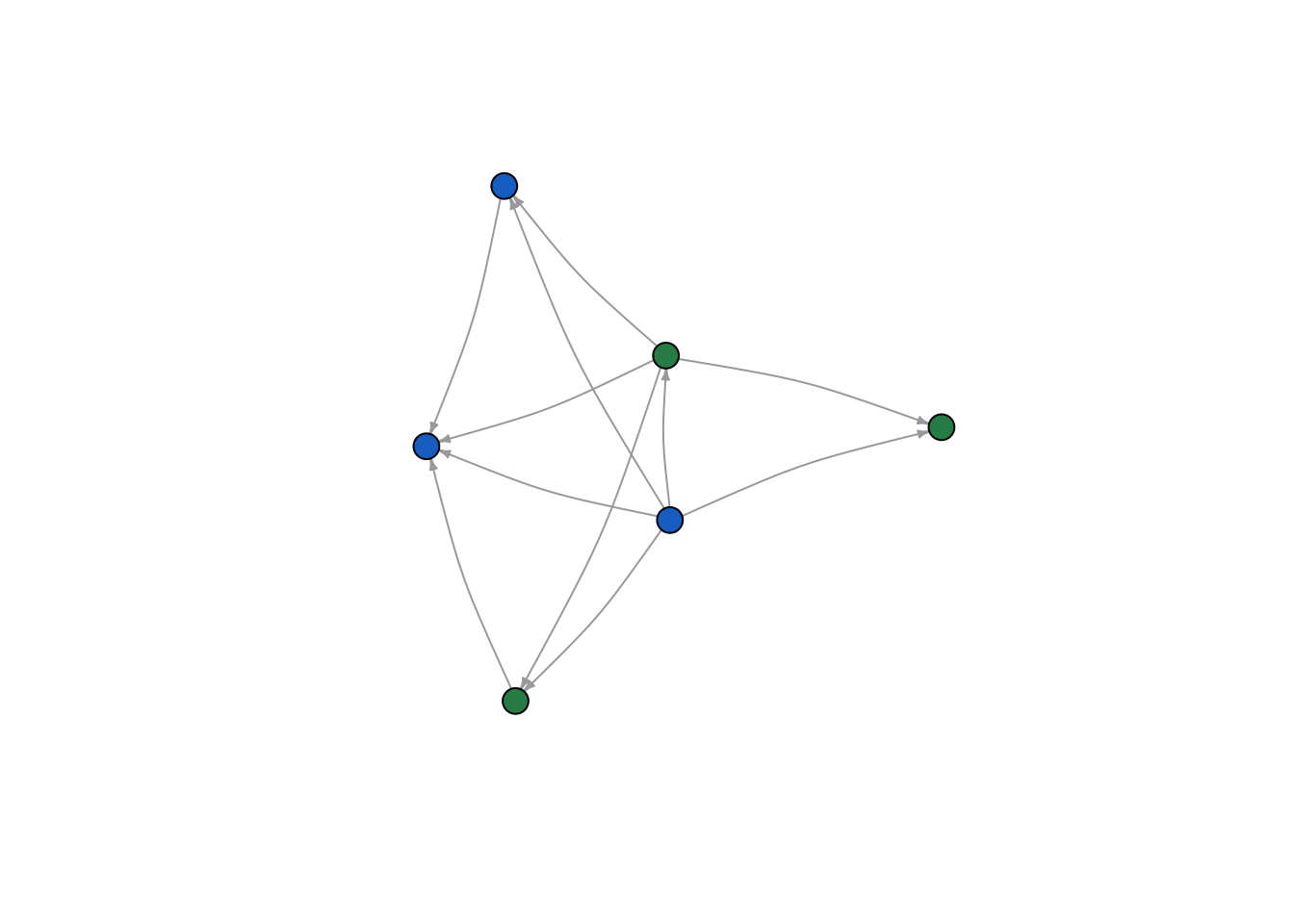V(moneyNetwork)$color <- ifelse(V(moneyNetwork)$Gender == "Male", "dodgerblue3","seagreen")Now we can replot the network. This time a node’s color will be green or blue depending on their gender. Notice that I didn’t set the vertex.colors inside the plot function this time, since doing so would override the colors we just gave the nodes.