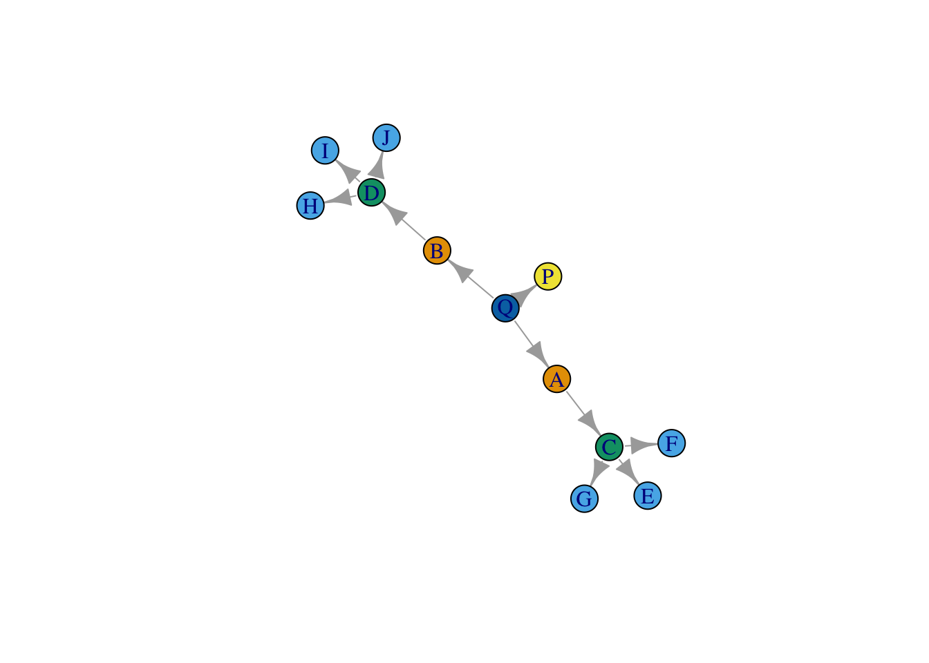 net <- graph.edgelist(as.matrix(el), directed = T)What does the network look like? Let’s plot it, and color nodes by their equivalence class.