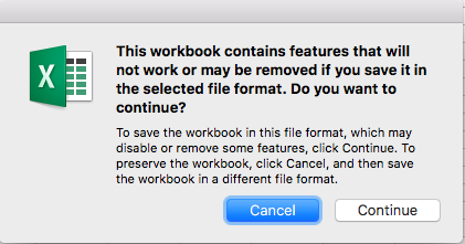 It will ask will warn you that the workbook contains features that will not work or may be removed if you save it in the selected file format and ask if you want to continue. Click “Continue”.