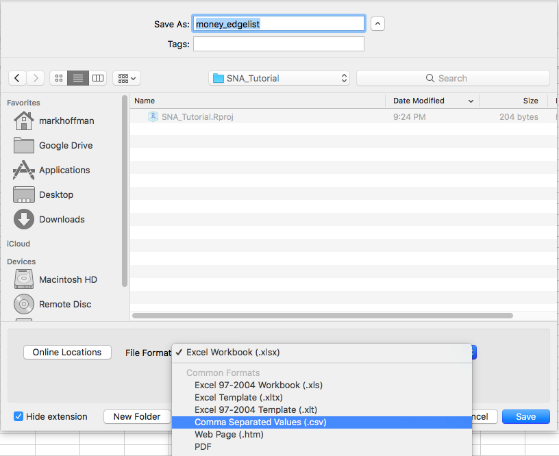 Then give your file a name (I chose “money_edgelist”), choose the place where you want to save it (inside of the directory you made for class), and finally (the most important part!), click on the “File Format” dropdown menu and choose “Comma Separated Values (.csv)”. Click “Save”!