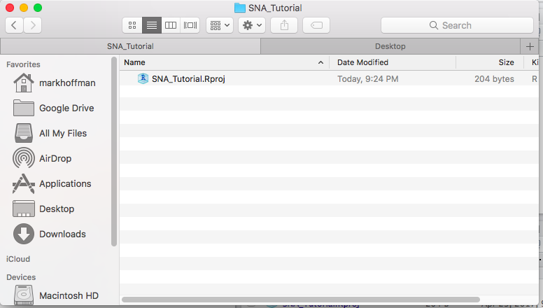 Now if you navigate to the folder of your new R Project (mine is on my Desktop in the folder titled “SNA Tutorial”, for example), you will see the R Project there, symbolized by a blue glass cube with an R in it. If you ever want to re-open this project, you can double click on the cube. Alternatively, in RStudio you can go “File -> Open Project”, navigate to the project’s directory and open it from there.