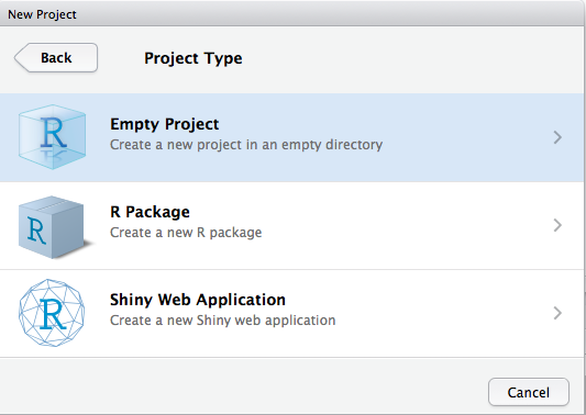 Now start an empty project. Projects are created by RStudio and they maintain your R workspace for you, so that you can load it exactly as it was before you closed RStudio.