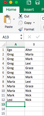 The first step in any network analysis project is to create a dataset with the relationships between the people in your study. The easiest way to record relationships in Excel is as an edge list, which, as we discussed in the last section, is a two column matrix that lists the pairs of actors in a relationship.