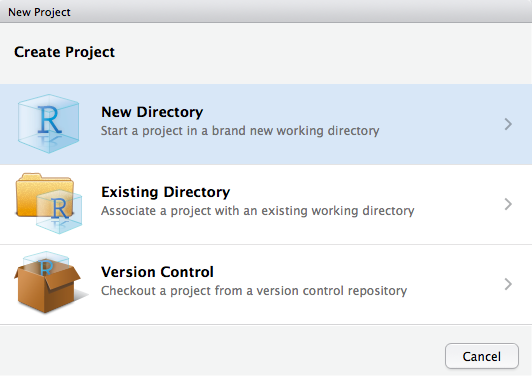 Then start a new directory. Directories are folders where you keep your R Project and all of the data, files, code etc. that you create and use in the project.