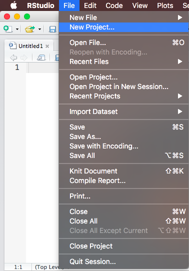 First let’s create a new R project. RStudio projects allow you to keep your various data analysis projects separate from one another. Each project has its own working directory, workspace, history, and source documents. When you load a project, you will therefore see the work, history and files associated with that project, helping your organize your work.