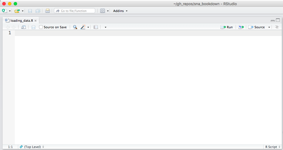 Open up RStudio, make sure you are in your project for class (if not, go to “File -> Open Project”, and selection your project), and open a new R Script by going “File -> New File -> R Script”. Save the empty script and name it “loading_data.R”. Your RStudio should look like this: