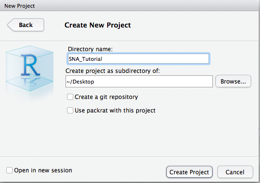 Finally name your project (I named mine “SNA_Tutorial”) and browse to find the location on your computer where you would like it to be saved. We will use this directory to store all of the files and information for the class, so make sure to choose a name you can remember.