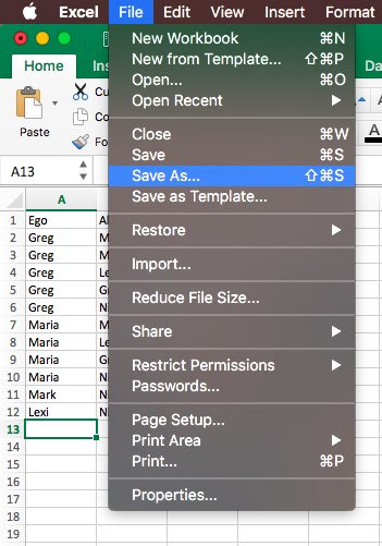 To save an Excel sheet as a .csv file, in Excel go to “File -> Save As…”