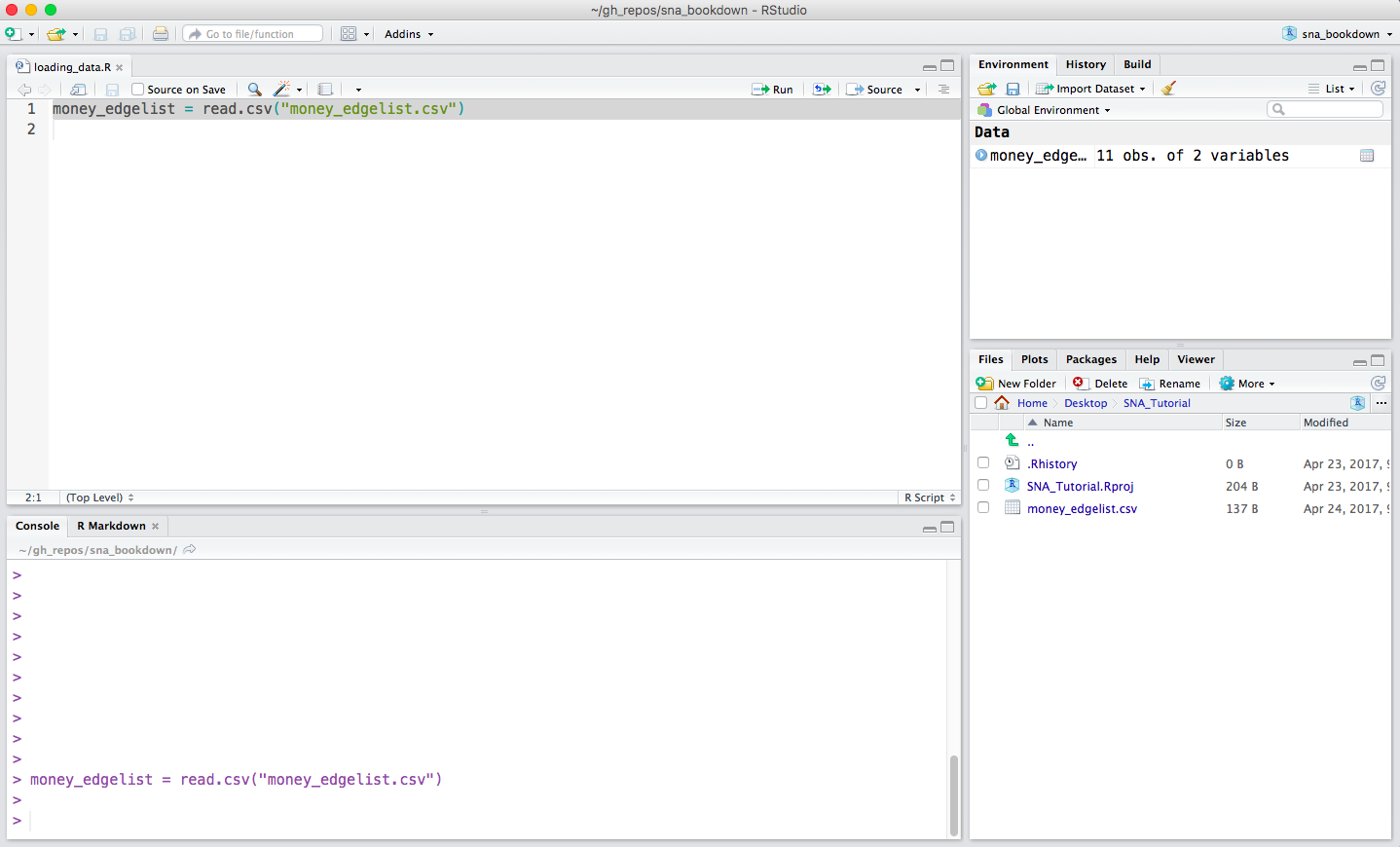 money_edgelist = read.csv("Data/money_edgelist.csv")Now you should see your data fle in your Environment pane under the “Data” heading. That means you successfully loaded the data into R.