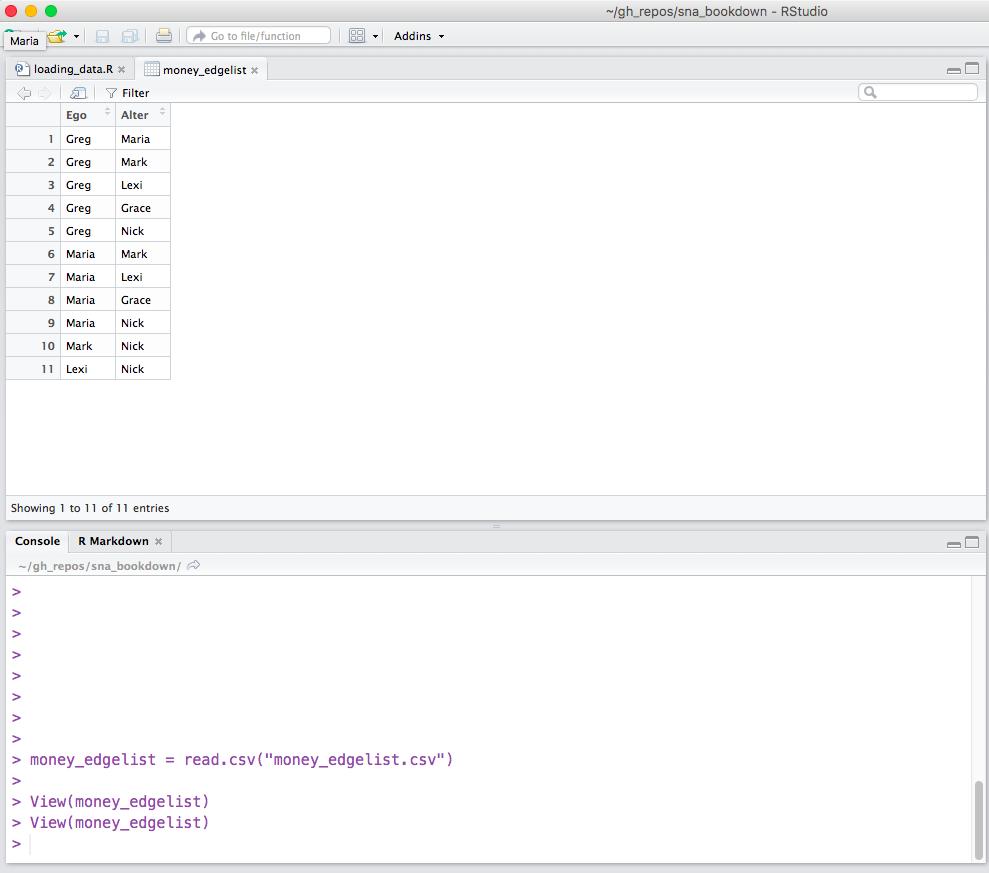 Great! Now, inside of your class directory, you should see a new file titled “money_edgelist” (or whatever you chose to name it). In the following section, we will learn how to read that edge list into R.