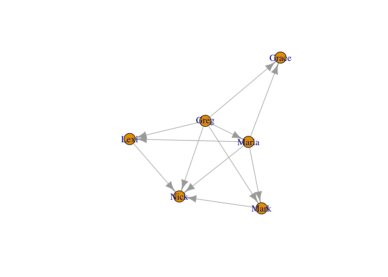 V(moneyNetwork)$name## [1] "Greg" "Maria" "Mark" "Lexi" "Grace" "Nick"