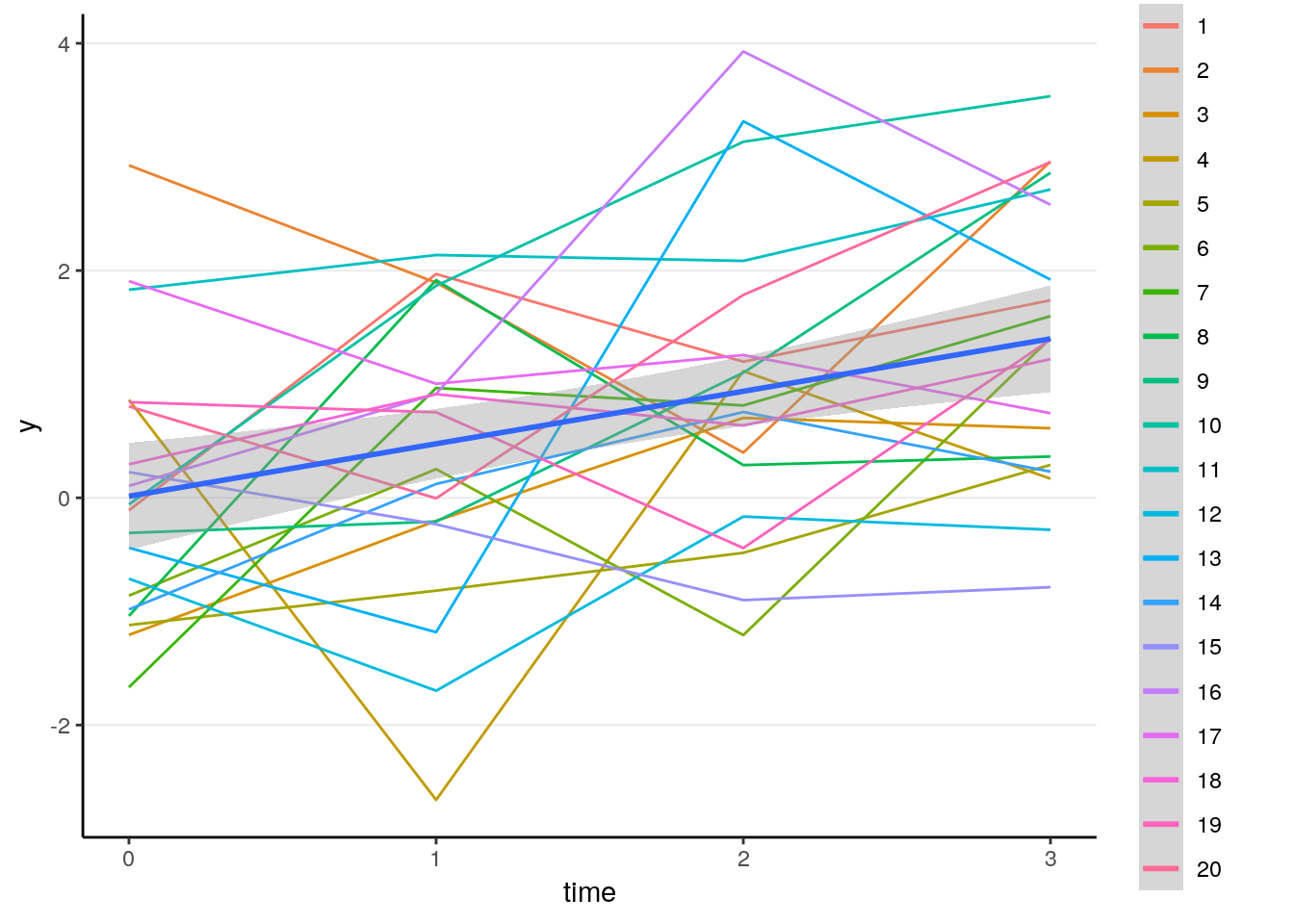 ggplot(aes(x = time, y = y, color = factor(pid), group = pid)) +