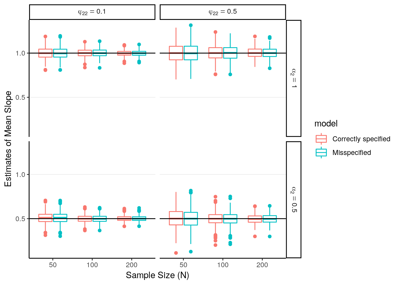 - From the simulation results, evaluate the relative efficiency of the estimated average slope (i.e., \(\alpha_2\)) under model 2 relative to that under model 1.