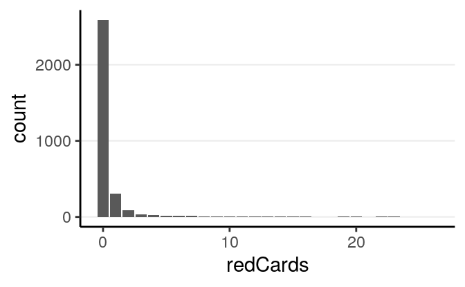 Let’s use the example you’ve seen on studying the distribution of number of red cards, which we first learned the Poisson distribution. Here, however, we’re interested in what predicts the number of red cards a referee will give. In the data, there are 3147 referees.