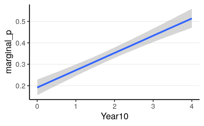 \[\begin{align*} \texttt{marginal_p}_j & \sim \mathrm{Bin}(n_j, \mu_j) \\ \mu_j & = \mathrm{logistic}(\beta_0 + \beta_1 \texttt{Year10}_j). \end{align*}\]