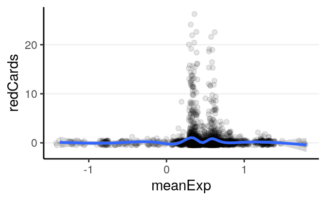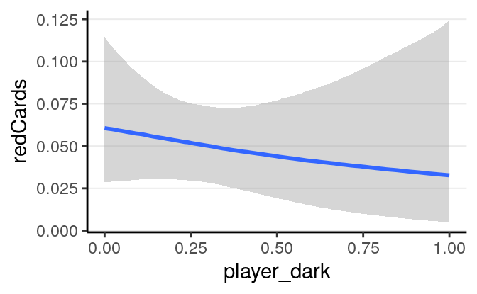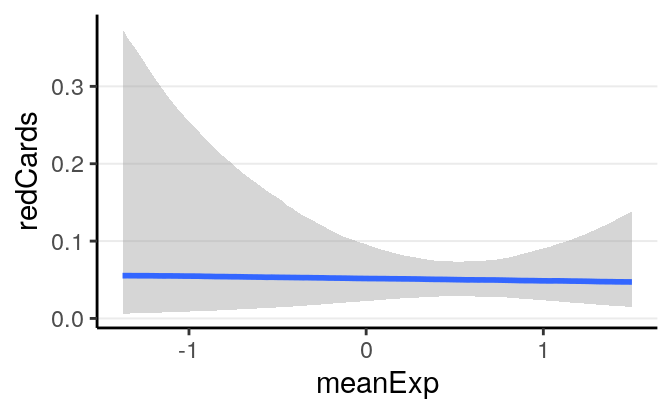 As shown above, the fit wasn’t terrible but also wasn’t very good for the Poisson model. One major problem is that the number of red cards for each player is limited to only 1, so the counts are actually bounded to be the total number of games. Also we aggregated the data by referees, but because many different referees also gave red cards to the same players, the player-level clustering hasn’t been accounted for.