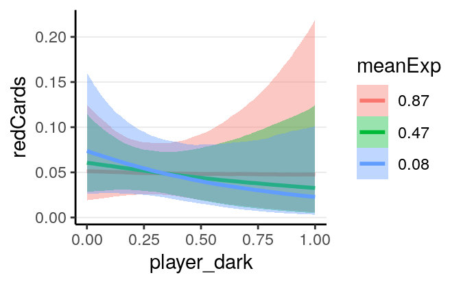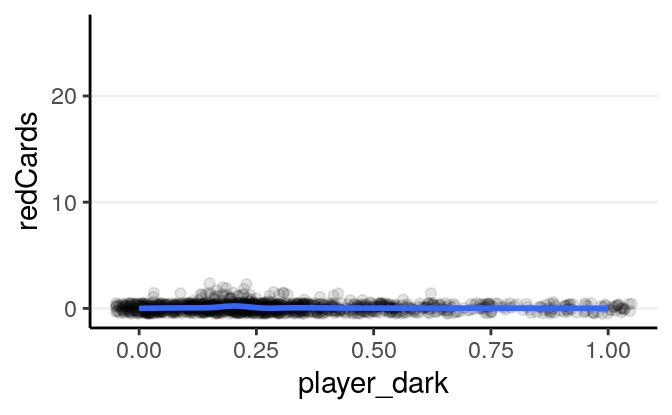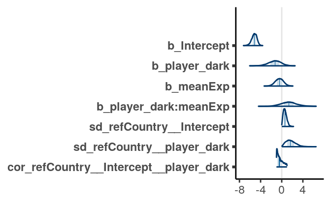 First, because the referees are nested within countries, we need to account for that clustering. Second, the number of red cards depends on how many games a referee has called, so we need to adjust for that by including an offset term. The following is the equation of the Poisson model: \[\begin{align*} \texttt{redCards}_{ij} & \sim \mathrm{Pois}(\mu_{ij}) \\ \log(\mu_{ij}) & = \log(\texttt{games}_{ij}) + \beta_{0j} + \beta_{1j} \texttt{player_dark}_{ij} \\ \begin{bmatrix} \beta_{0j} \\ \beta_{1j} \\ \end{bmatrix} & \sim \mathcal{N}_2\left( \begin{bmatrix} \mu^{[\beta_0]}_j \\ \mu^{[\beta_1]}_j \\ \end{bmatrix}, \boldsymbol{\mathbf{T}} \right) \\ \boldsymbol{\mathbf{T}} & = \operatorname{diag}(\boldsymbol{\mathbf{\tau}}) \boldsymbol{\mathbf{\Omega }}\operatorname{diag}(\boldsymbol{\mathbf{\tau}}) \\ \mu^{[\beta_0]}_j & = \gamma_{00} + \gamma_{01} \texttt{meanIAT}_j \\ \mu^{[\beta_1]}_j & = \gamma_{10} + \gamma_{11} \texttt{meanIAT}_j \end{align*}\] And I will use these priors: \[\begin{align*} \gamma_{00} & \sim t^+(4, 0, 5) \\ \gamma_{10} & \sim t^+(4, 0, 2.5) \\ \gamma_{01} & \sim t^(4, 0, 2.5) \\ \gamma_{11} & \sim t^(4, 0, 2.5) \\ \tau^{[\beta_m]} & \sim \mathrm{Gamma}(2, 0.2), \; m = 0, 1 \\ \boldsymbol{\mathbf{\Omega }}& \sim \mathrm{LKJ}(1) \end{align*}\]