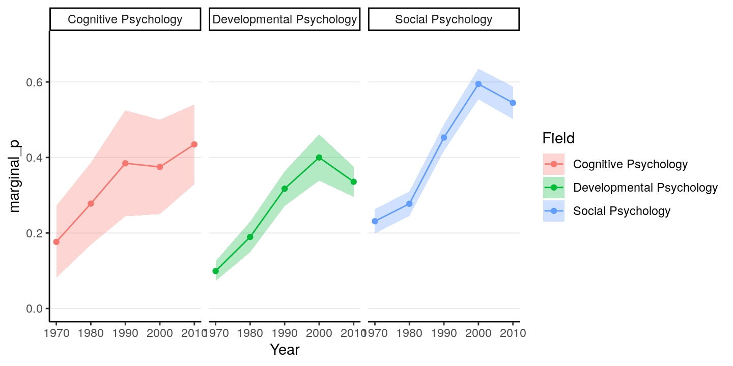 We will use an example from Pritschet, Powell, and Horne (2016), which examines how common it was for researchers to report marginal \(p\) values (i.e., .05 < \(p\) \(\leq\) .10). The outcome is whether a study reported one or more marginal \(p\) values (1 = Yes, 0 = No). The researchers also categorized the studies into three subfields (Cognitive Psychology, Developmental Psychology, Social Psychology), and there were a total of 1,535 studies examined from 1970 to 2010.