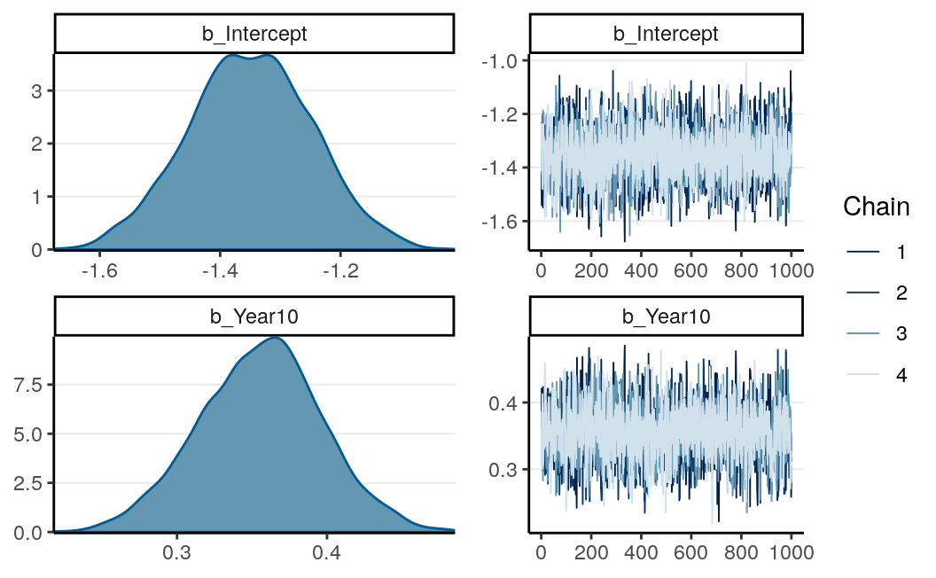 m1_bin <- brm(marginal_p | trials(n) ~ Year10,